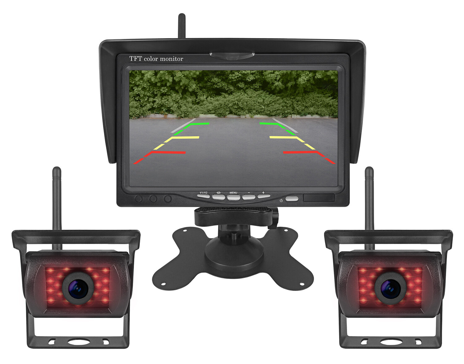 | Подробная комплектация | TFT дисплей, Wi-Fi камеры (2 шт.), Кабель (видео и питание), Пульт ДУ |