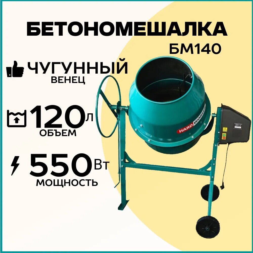 Бетономешалка строительная HARD WORKER БМ140 чугунный венец, объем 120 литров, мощность 550 Вт, бетоносмеситель электрический интересное: