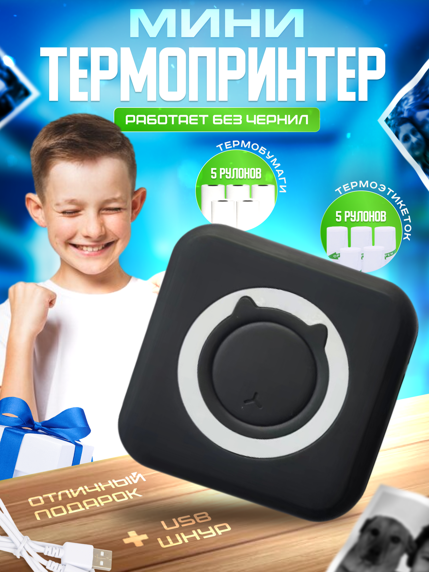 | Комплектация | Мини принтер, USB, 5 рулонов термобумаги |