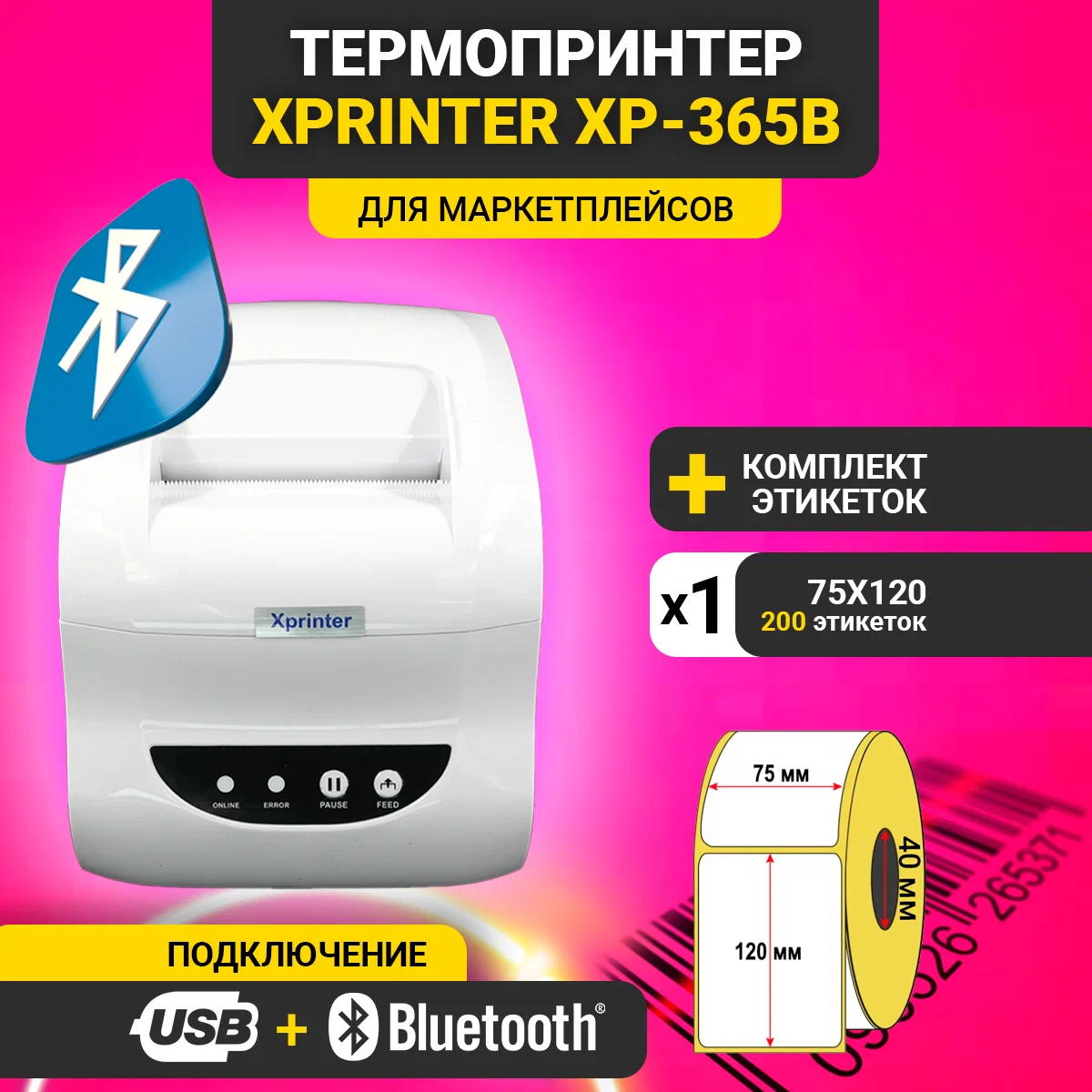 Купить Термопринтер чеков и наклеек Xprinter XP-365B USB + Bluetooth белый (русская версия, EAC) + этикетки 75*120мм 1 рулон 200 этикеток