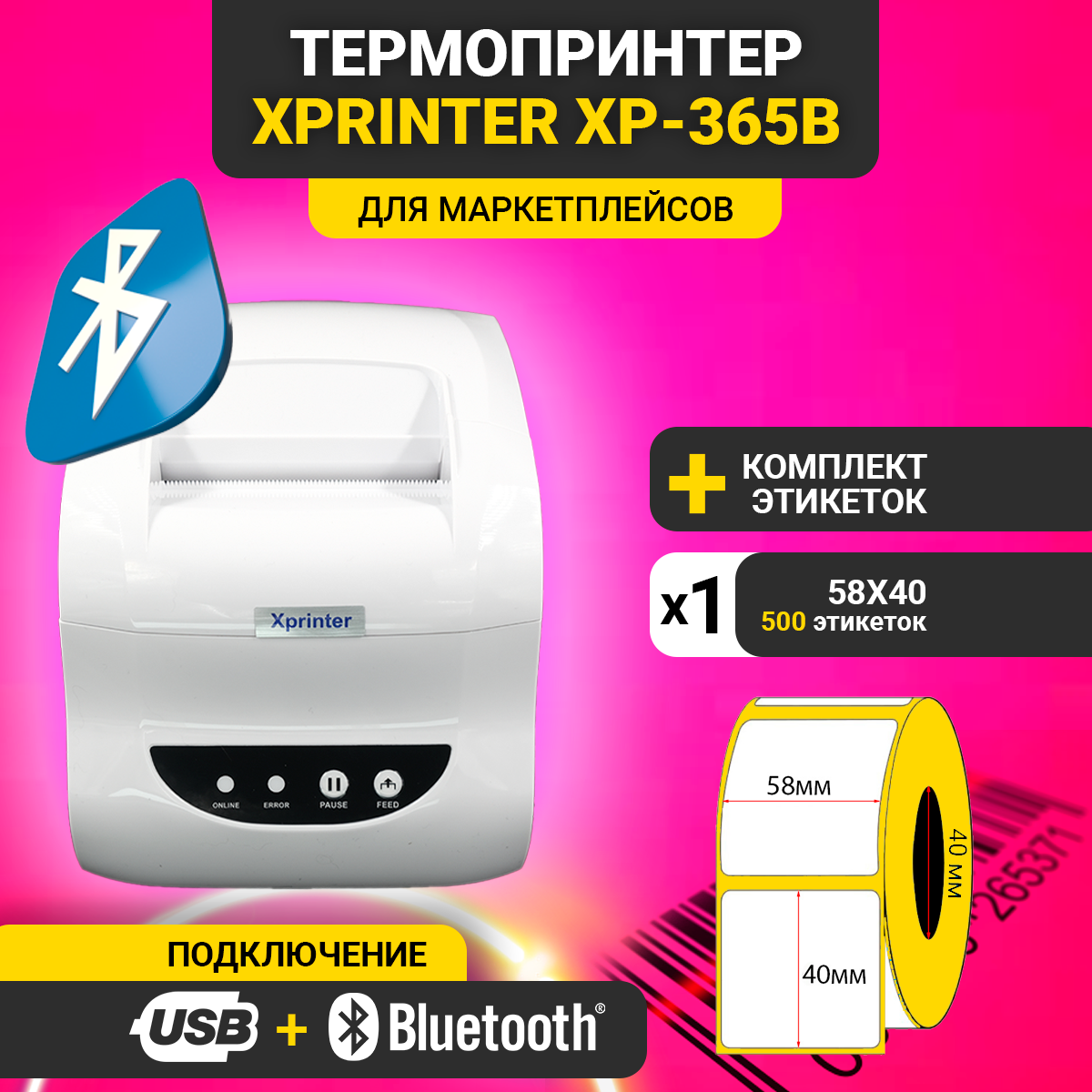 Купить Термопринтер чеков и наклеек Xprinter XP-365B USB + Bluetooth белый (русская версия, EAC) + этикетки 58*40мм 1 рулон 500 этикеток