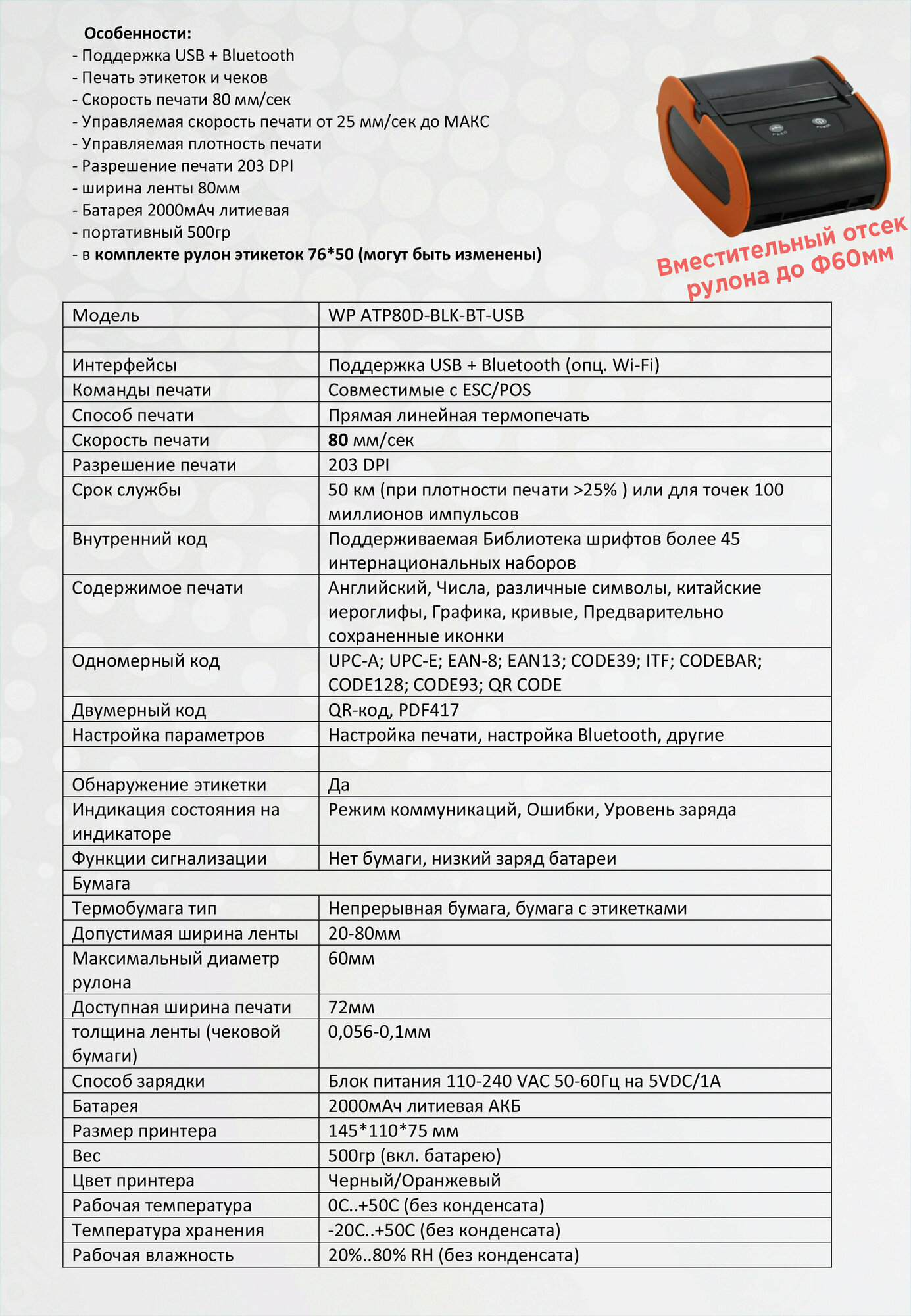 Термопринтер портативный для этикеток 80мм Bluetooth+USBC. Android, iOS, ПК. Этикетки отправлений озон, Вайлдбериз . Черно-Оранжевый. WP ATP80D интересное: