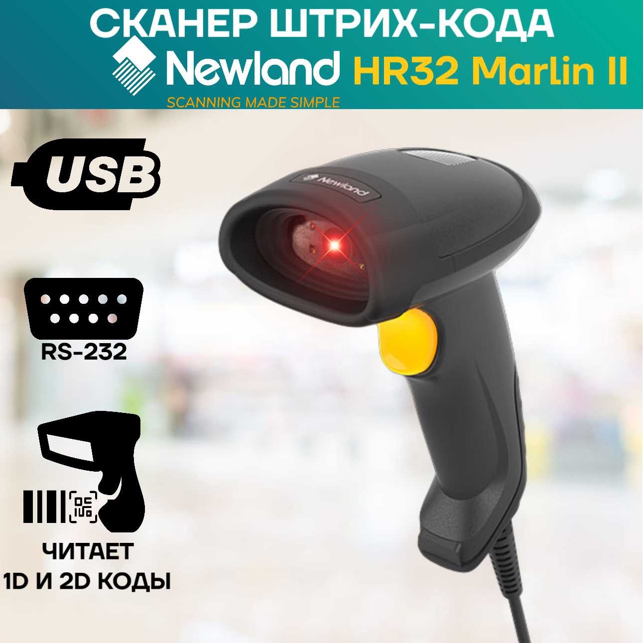 Сканер штрих-кода Newland HR32 Marlin II LITE- 2D CMOS Handheld Reader with USB cable. autosense. (smart stand compatible) интересное: