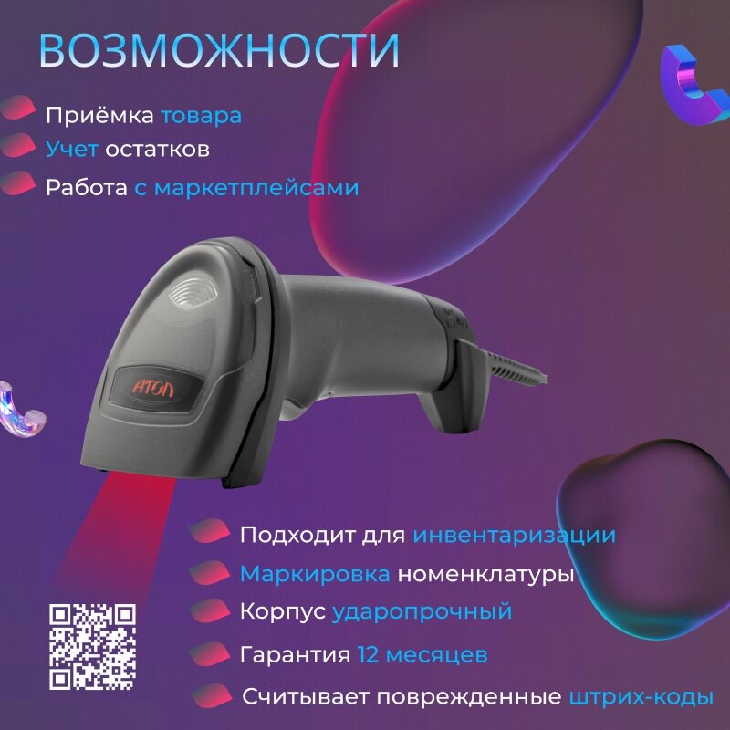 Сканер штрих кода АТОЛ SB2108 Plus проводной / ручной сканер / USB, 1D, 2D код /сканер для кассы и магазина, маркировки интересное: