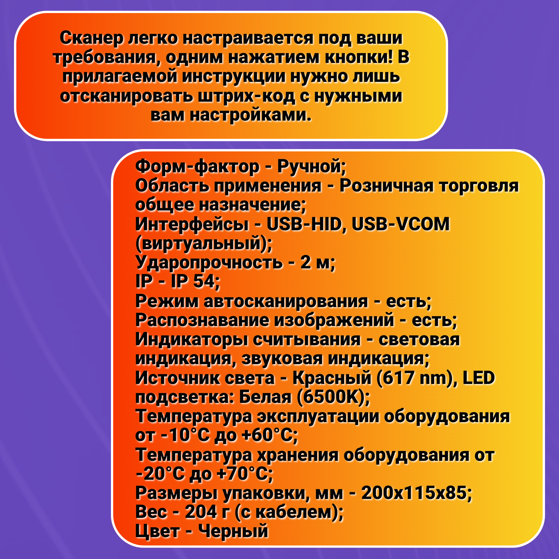 | Комплектация | Сканер штрих-кодов, кабель USB, инструкция по кодированию |