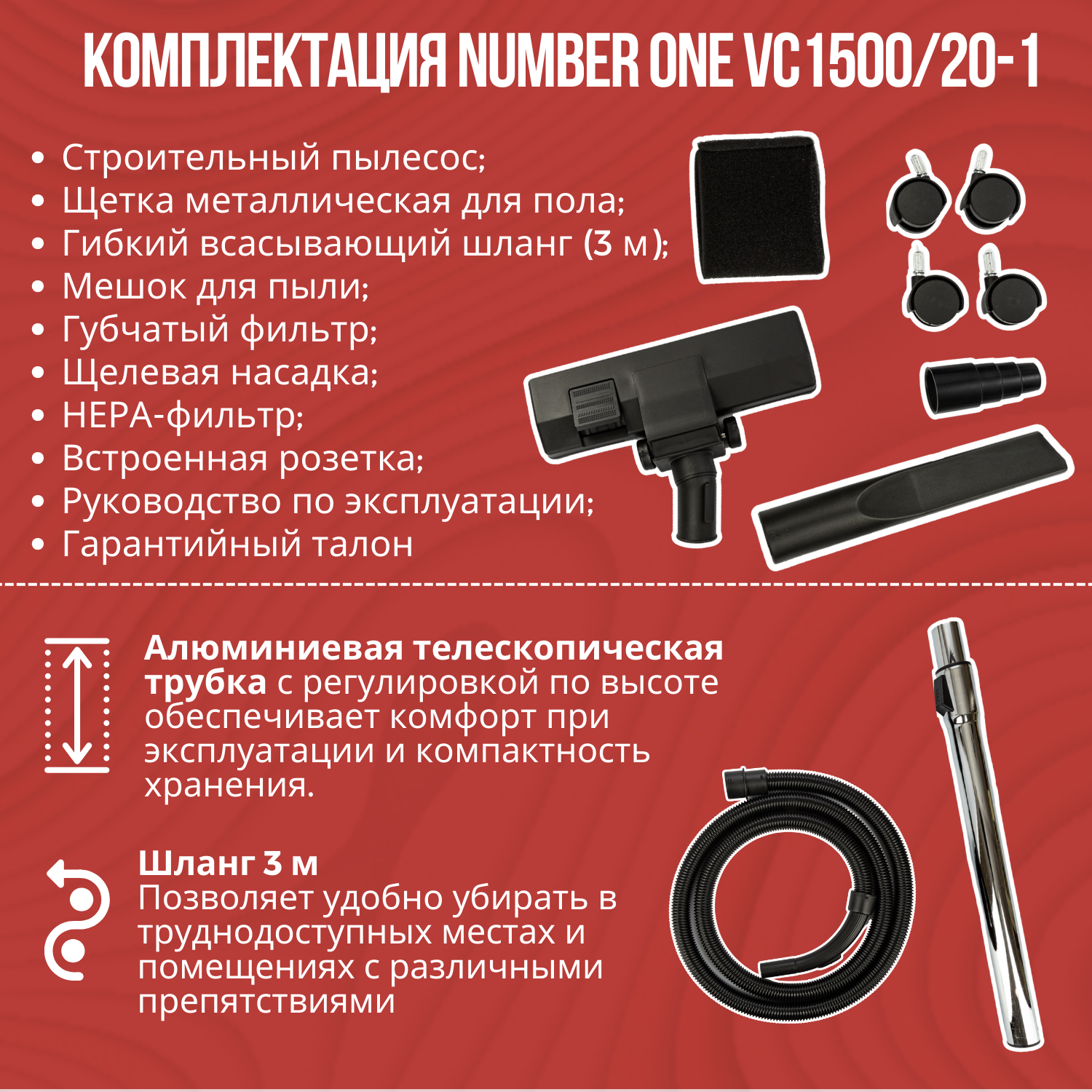 Строительный пылесос NUMBER ONE VC1500/20-1 20л, 1500Вт, 4м шланг, пылесборник.