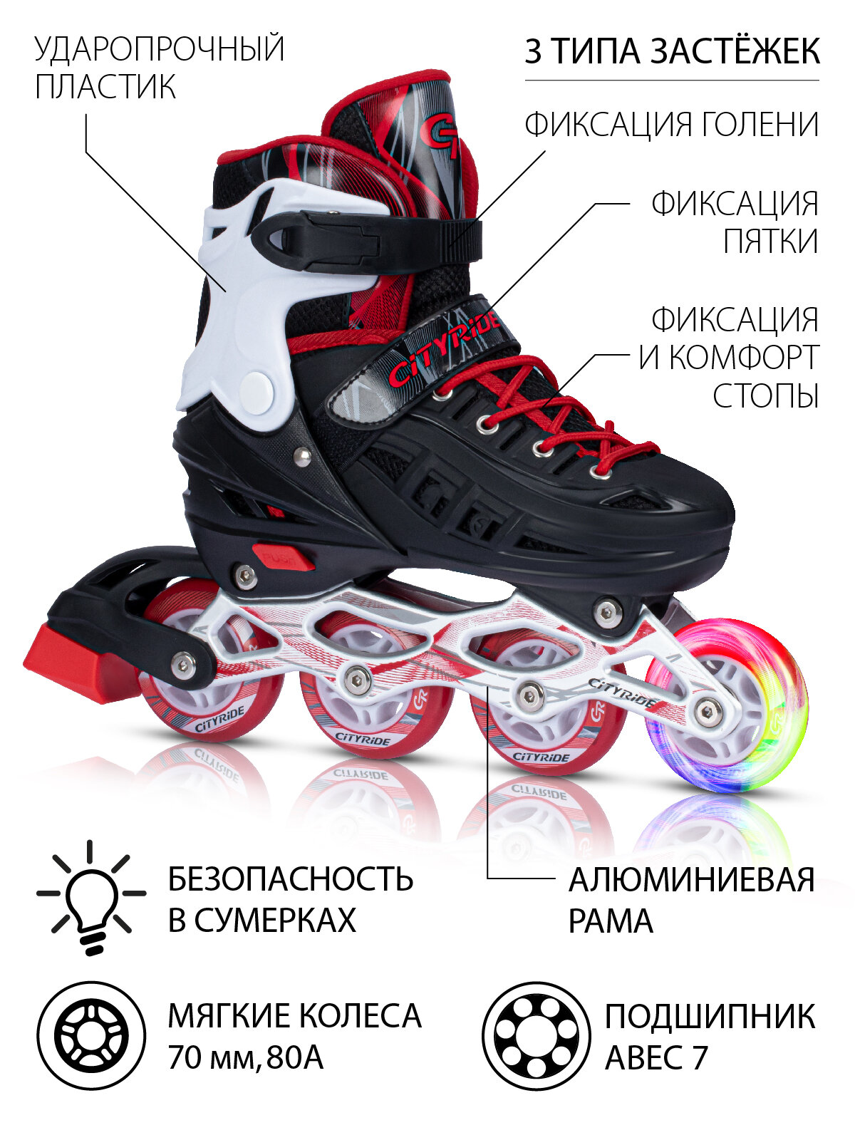 Купить Роликовые коньки детские ТМ CITY-RIDE, PU колеса, первое колесо светится, подшипники ABEC 7, размер M(34-38), раздвижные, JB8800098/M