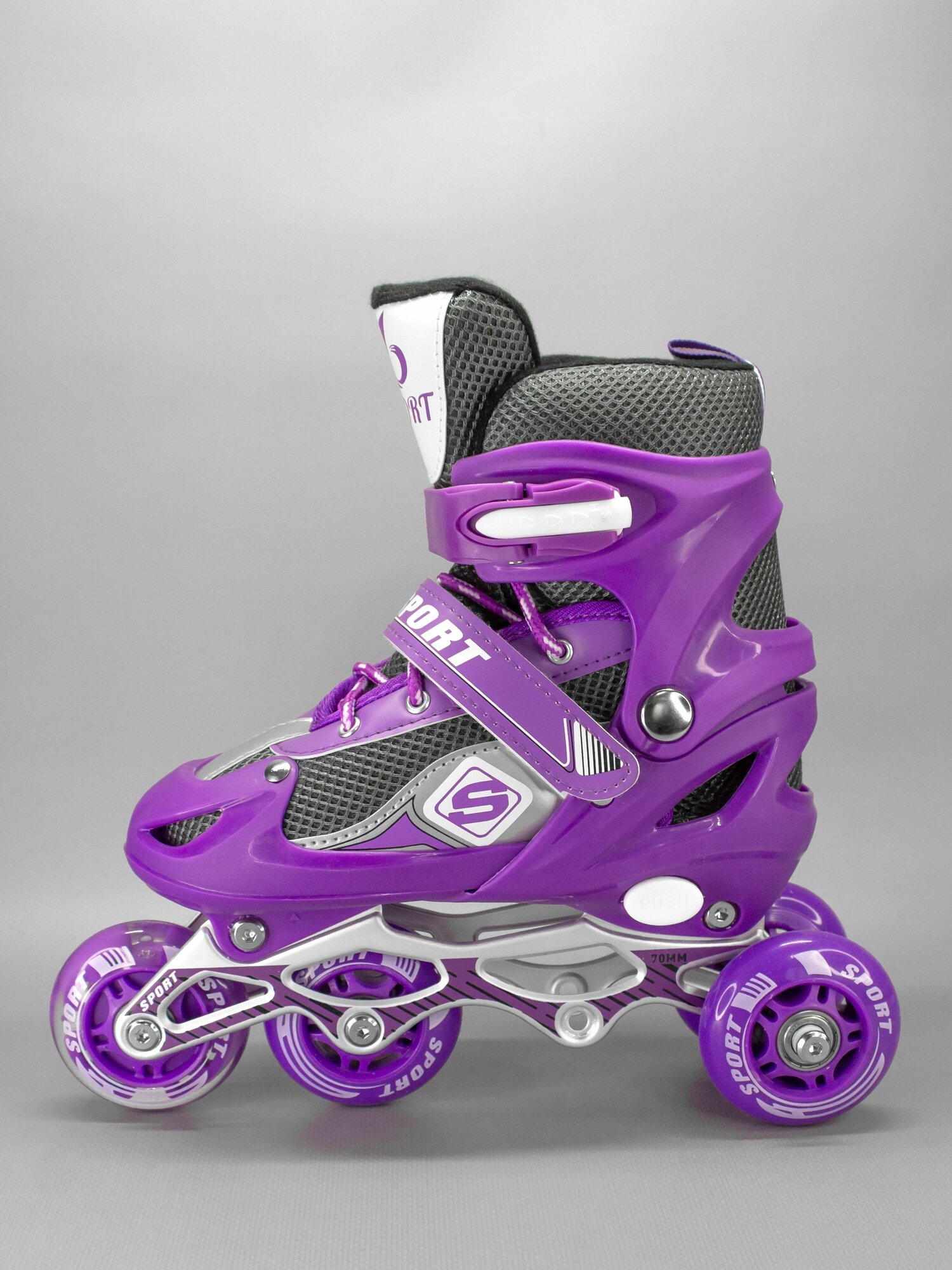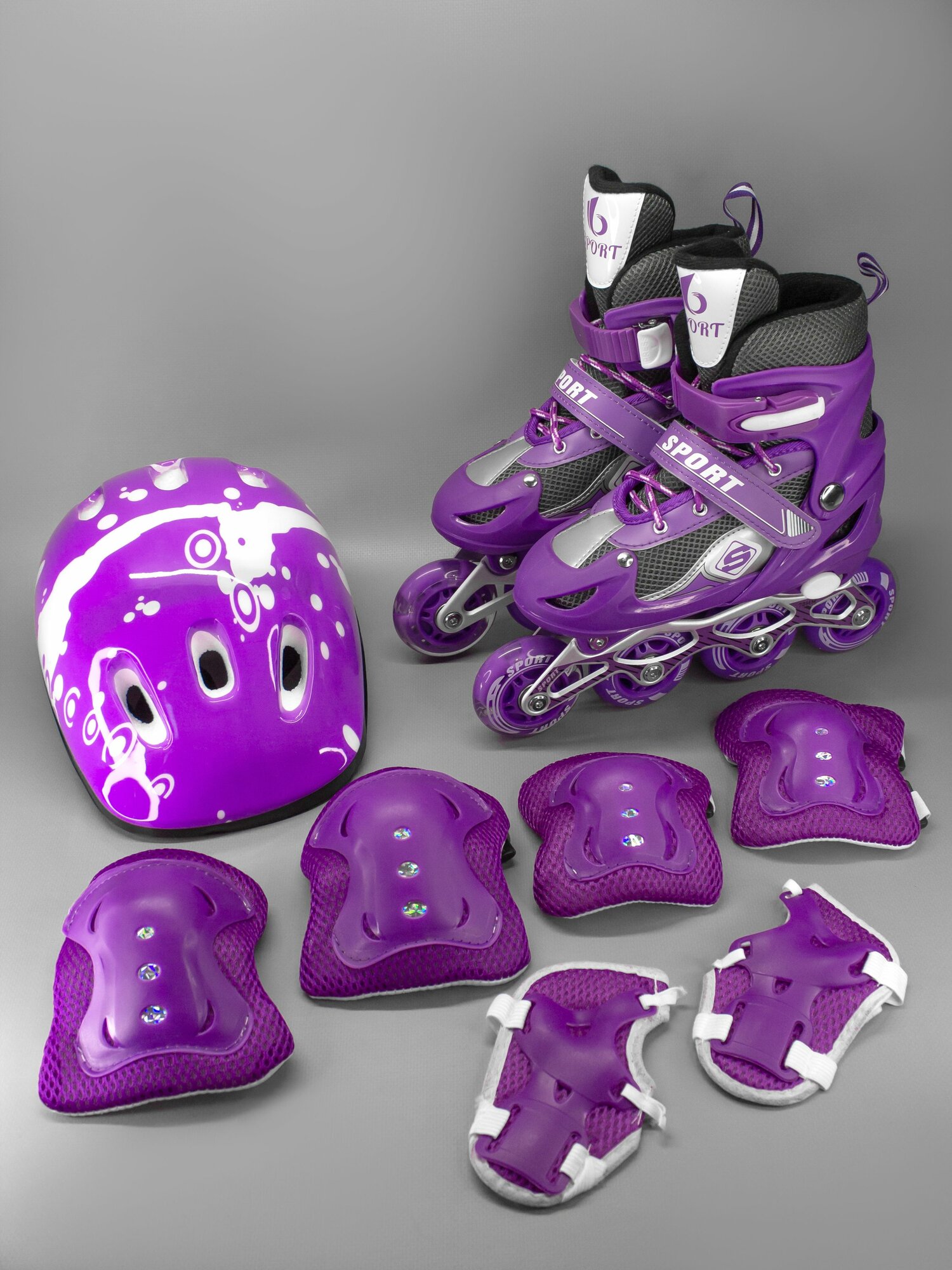 Купить Фиолетовые раздвижные роликовые коньки, шлем, защита коленей, локтей, кистей, сумка, размер 27-30