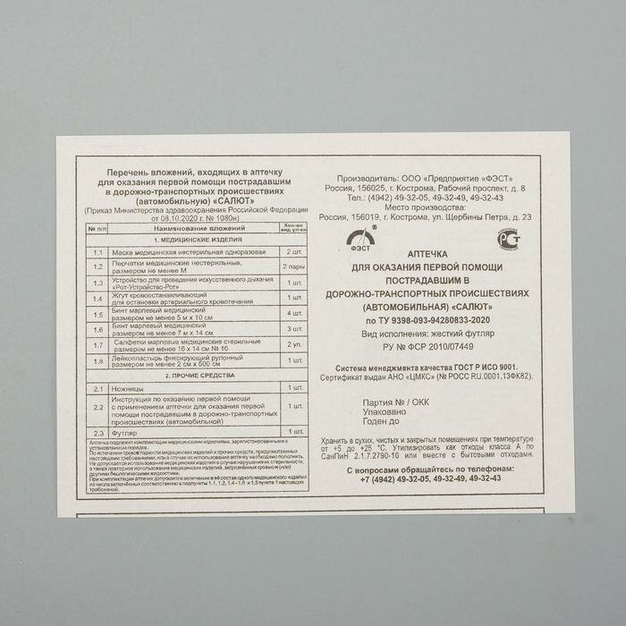 Аптечка автомобильная ФЭСТ футляр из полистирола, новый состав по приказу № 1080Н от 08.10.20
