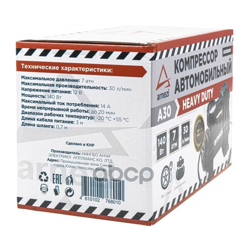 Компрессор автомобильный ARNEZI A30 Heavy Duty 7 бар, 30 л/мин, 140 Вт, A0302001 интересное:
