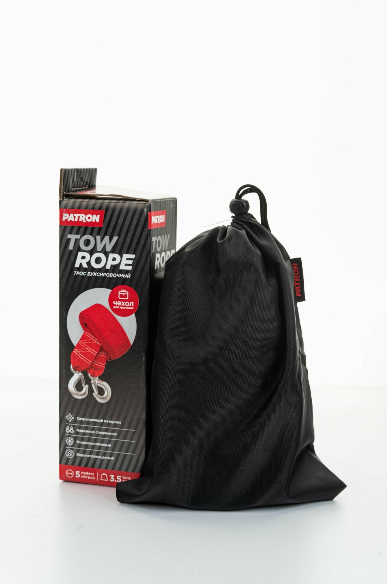 Трос буксировочный до 3.5 тонн, 5 метров, 2 крюка, сверхпрочная полипропиленовая нить, упаковка - картон + чехол для хранения PATRON PTR035 | цена за 1 шт