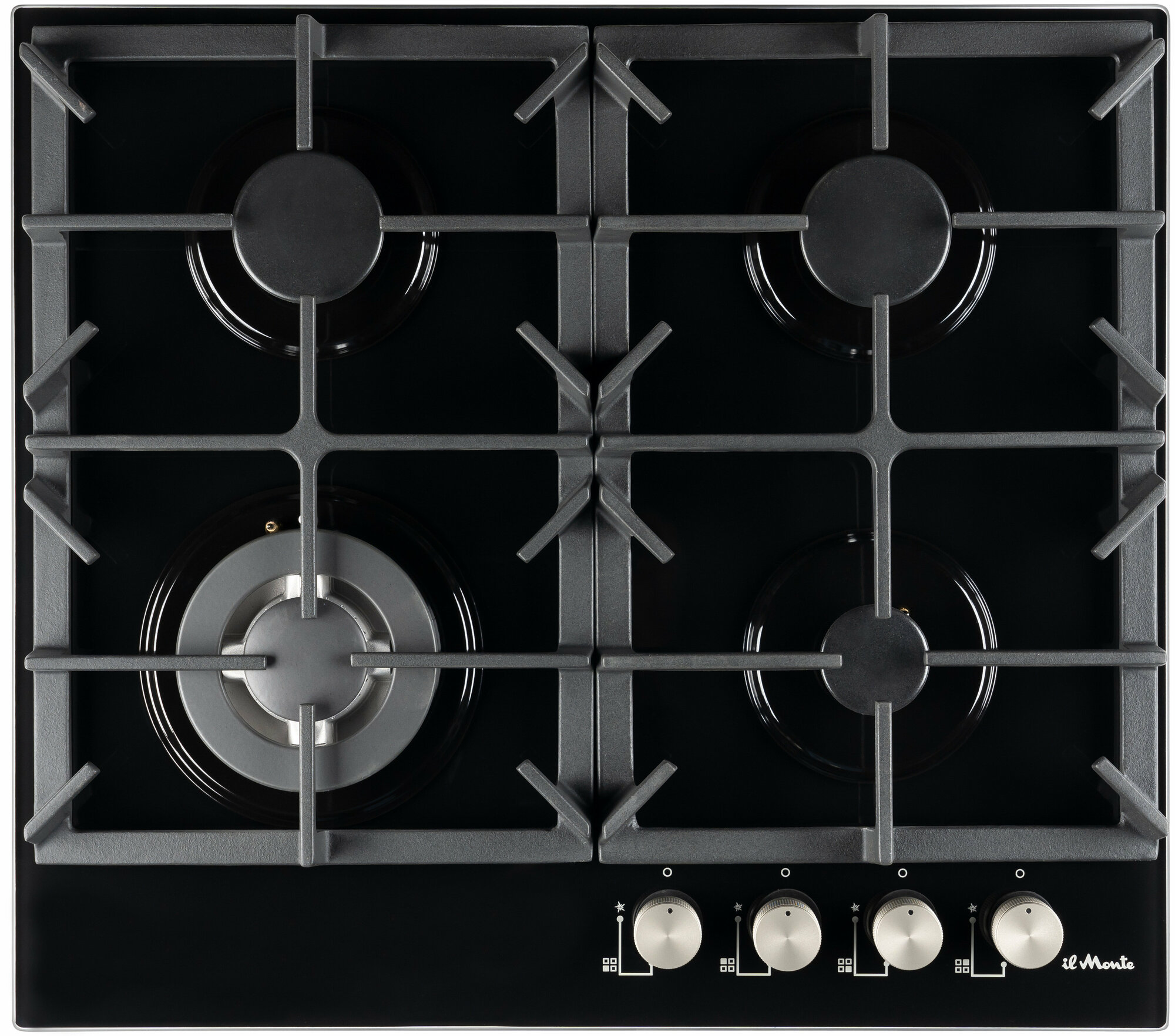 Варочная панель газовая, 60 см, Закаленное стекло, Газ-контроль, Турбо конфорка ВОК, Автоподжиг, Чугунные решетки, il Monte BH-614G