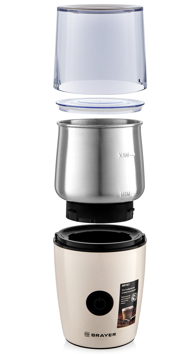 | Дополнительная информация | Мощность кофемолки 200 Вт Мощность капучинатора 20 Вт Емкость кофемолки 100 грамм Емкость капучинатора 140 мл Ножи из нержавеющей стали 2 чаши из нержавеющей стали Таймер (45 сек для кофемолки, 60 сек для капучинатора) Включение/выключение нажатием на кнопку |