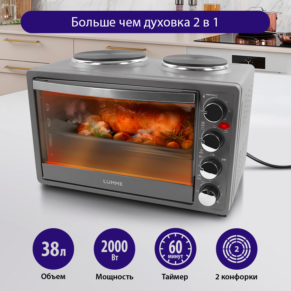 Мини-печь LUMME LU-1707 (38 литров, гриль + плитка) серебряный сапфир интересное: