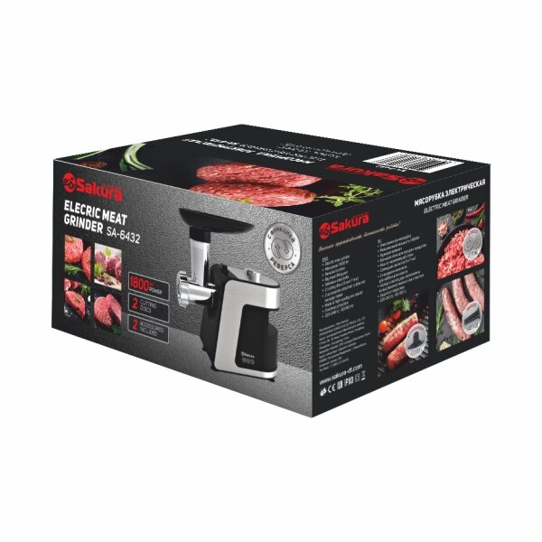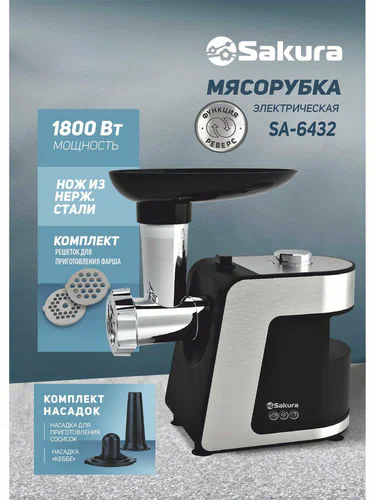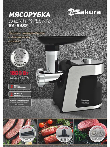 Купить Мясорубка Sakura SA-6432 реверс 1800Вт + 2 комплекта насадок ( для кеббе, для сосисок)