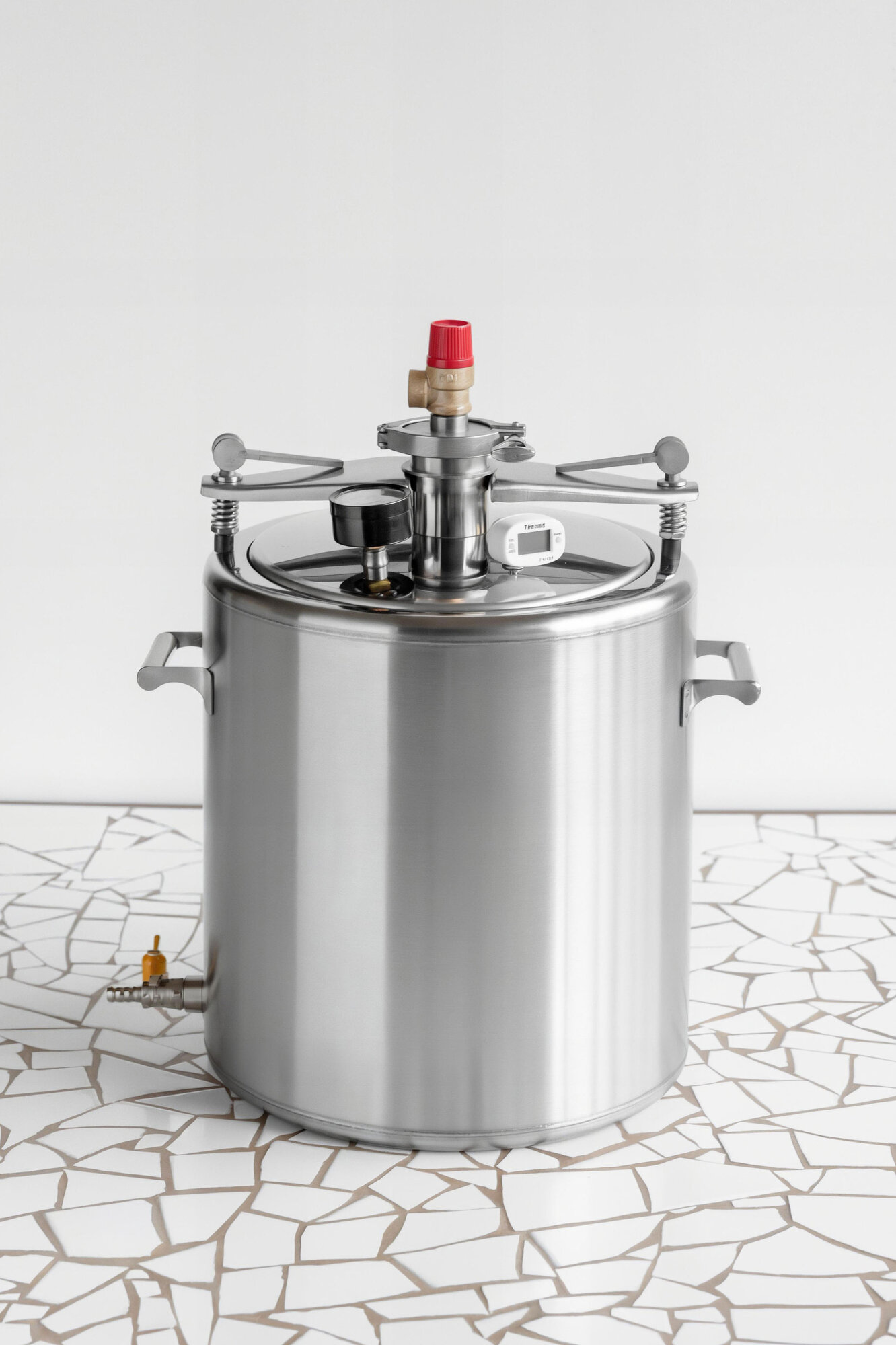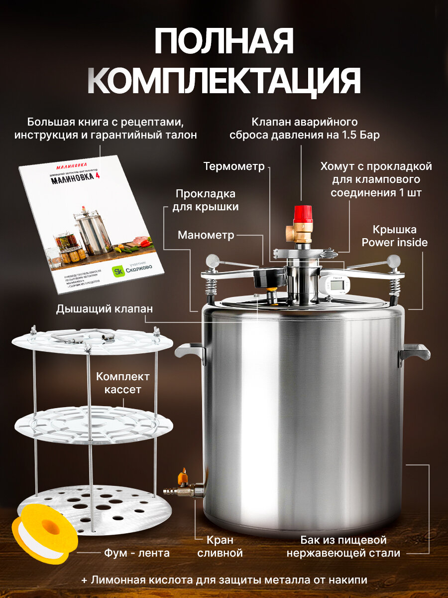 | Подробная комплектация | 1. Бак 42 литра из пищевой нержавеющей стали - 1 шт.; 2. Кассеты - 6 шт.; 3. Крышка Power inside - 1 шт.; 4. Прокладка для крышки - 1 шт.; 5. Перекладина для фиксации крышки - 1шт.; 6. Вентили для перекладины крышки (ручные болты) - 2 шт.; 7. Клапан аварийного сброса давления на 3 Бар. - 1 шт.; 8. Кран сливной - 1 шт.; 9. Хомут для клампового соединения - 1 шт.; 10. Термометр - 1 шт.; 11. Манометр - 1 шт.; 12. Инструкция - 1 шт.; 13. Гарантийный талон - 1 шт. |