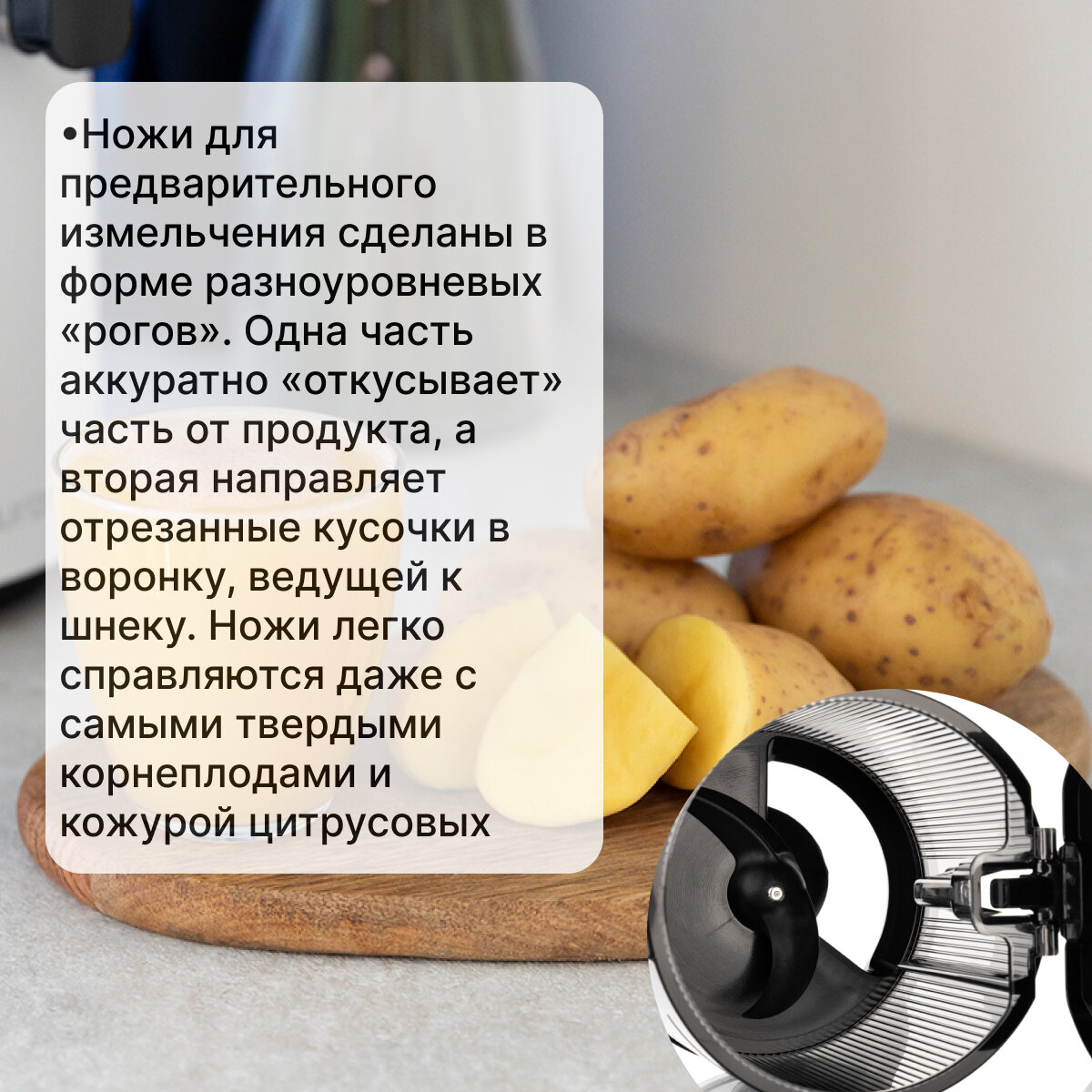 | Подробная комплектация | Корпус соковыжималки; Загрузочный отсек с крышкой и ножами; Отжимная корзина; Шнек; Внутренняя решётка фильтрующего элемента; Основная внешняя решётка фильтрующего элемента чёрного цвета; Дополнительная внешняя решётка фильтрующего элемента оранжевого цвета, предназначенная для смузи; Ёмкость для сока; Контейнер для жмыха; Толкатель; Щётка для очистки соковыжималки. |