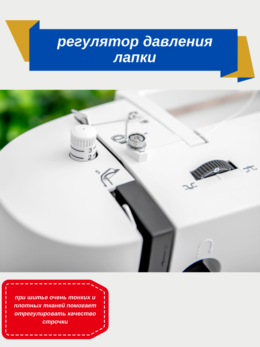 | Дополнительные функции | кнопка реверса, регулировка давления лапки на ткань |