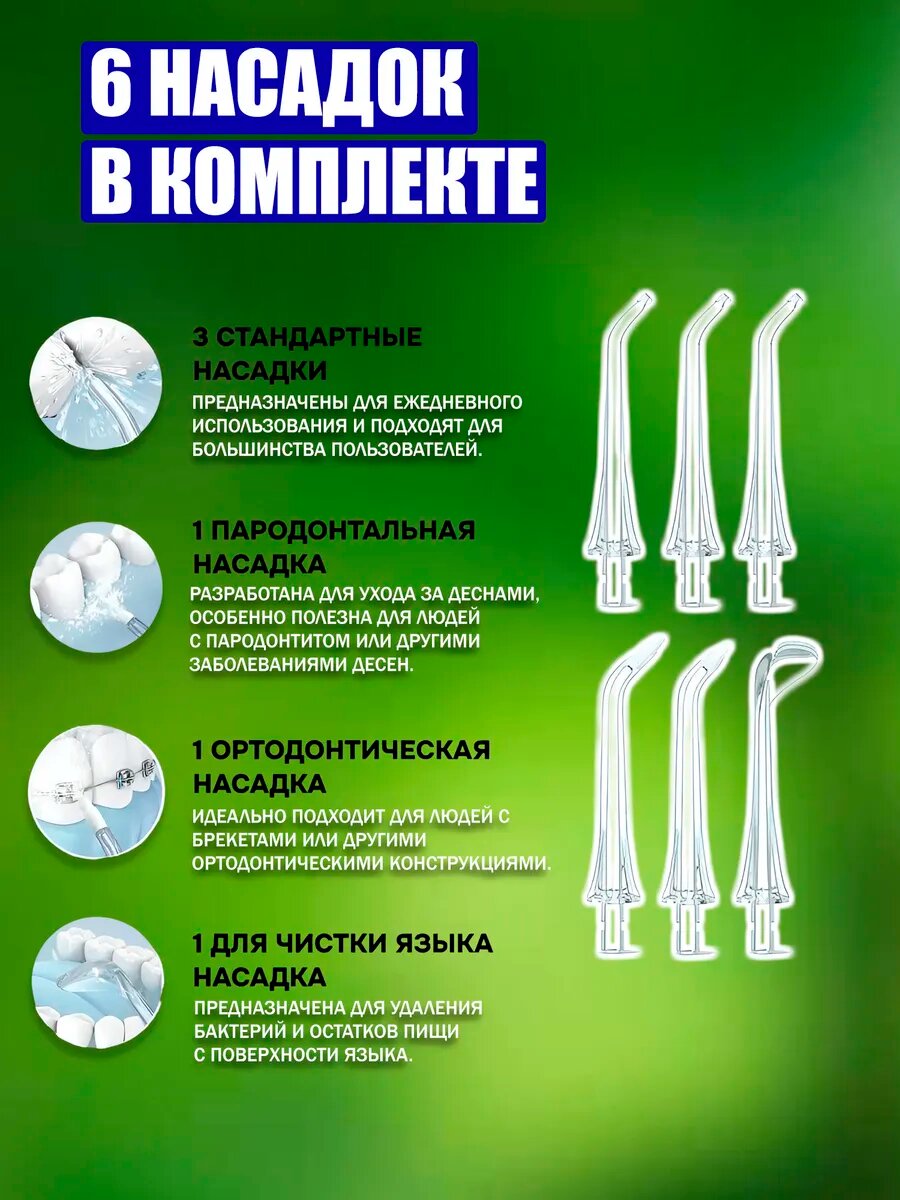 | Насадки | для струйной чистки / для чистки имплантов и коронок / для чистки языка / ортодонтическая (для брекетов) |