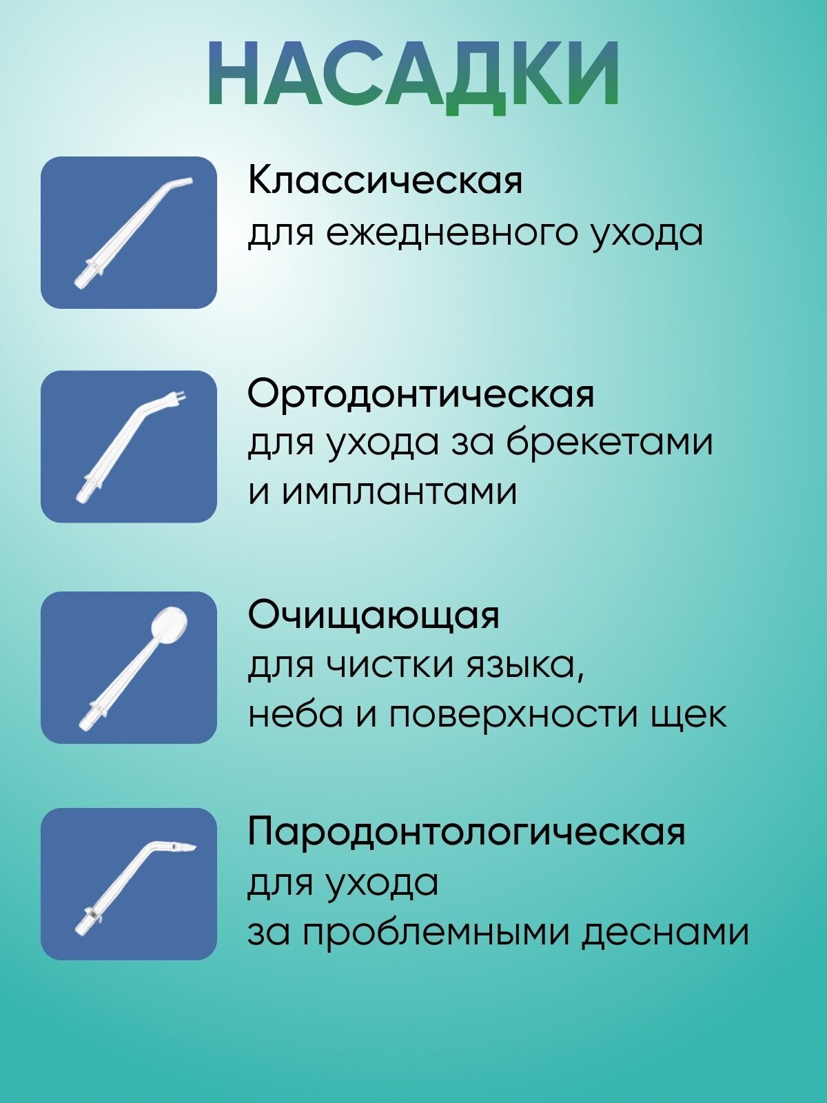 | Насадки | для струйной чистки / для чистки имплантов и коронок / для чистки языка / ортодонтическая (для брекетов) / пародонтологическая (для десен) |