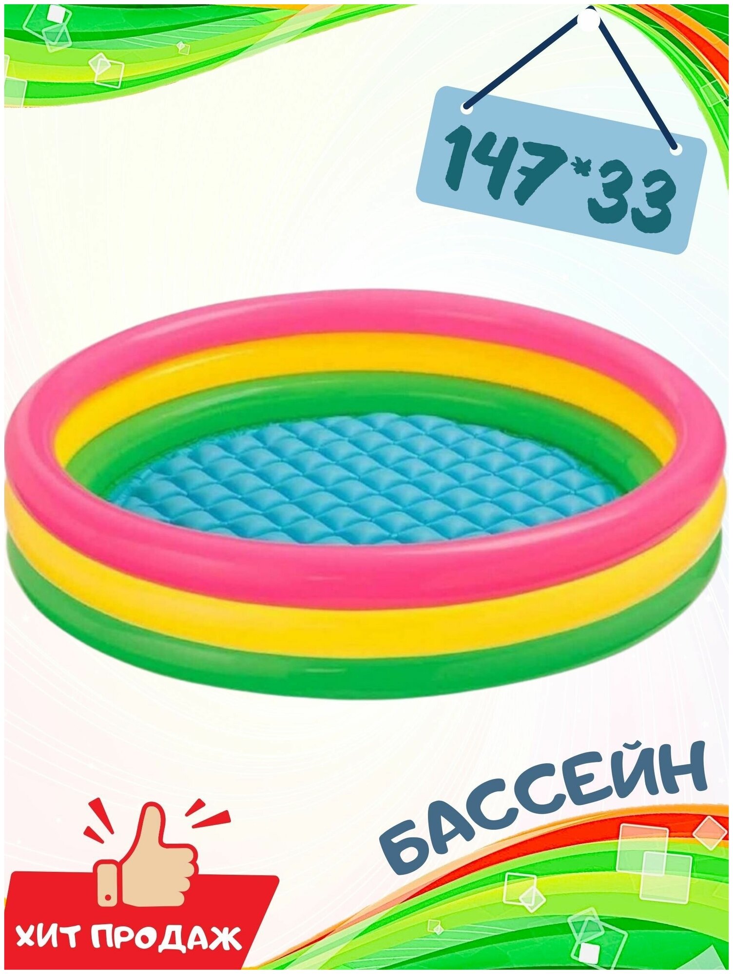 Бассейн надувной, детский, круглый, 3 кольца, от 2 лет, надувной пол, с ремкомплектом, для дачи, размер - 147 х 33 см интересное:
