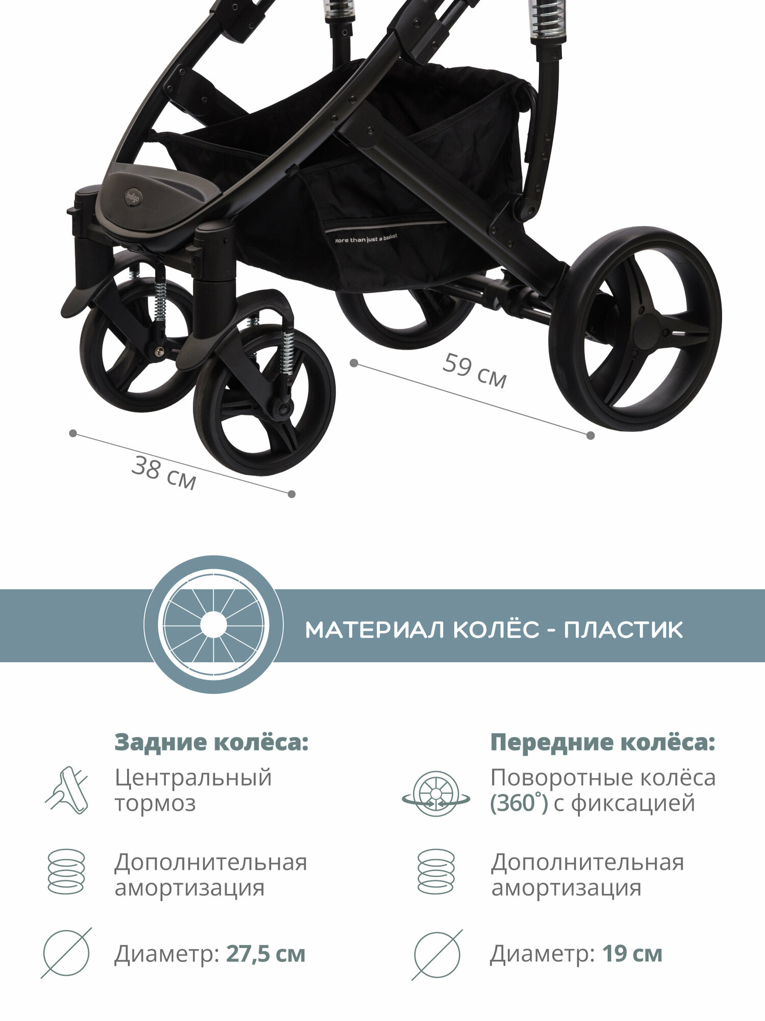 | Колеса | 4 шт., пластиковые, 19-27.50 см |