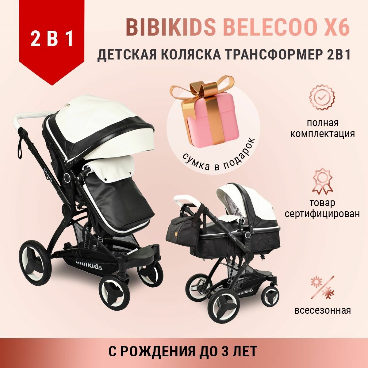 Купить Детская коляска 2 в 1 трансформер Bibikids Belecoo X6, люлька для новорожденных и прогулочная до 3х лет, Чёрно-белая