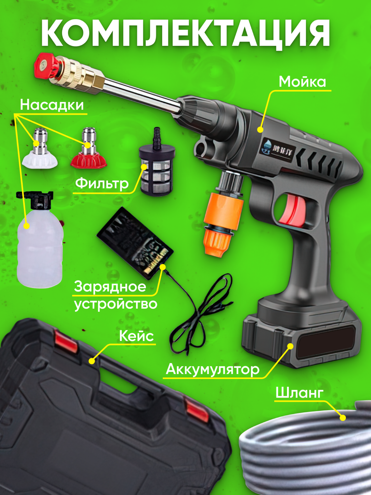 | Подробная комплектация | Мойка, 3 насадки, фильтр, зарядное устройство, аккумулятор для мойки, шланг, кейс. |