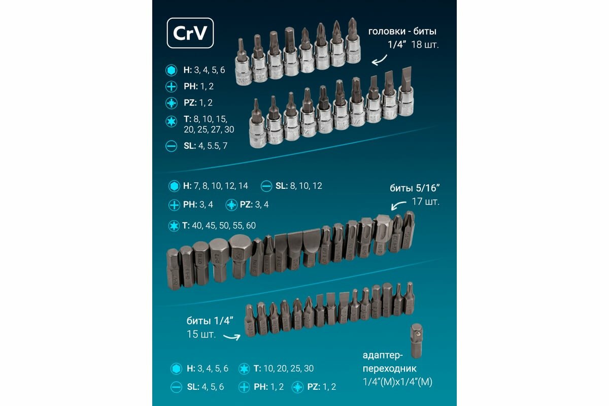| Шлицы бит | Torx (T/TX) / крестообразный (PH) / крестообразный (PZ) / прямой (SL) / шестигранный (H/HEX) |