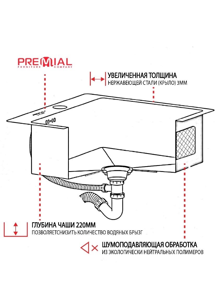 Мойка кухонная Premial 600 х 450 мм с дозатором для мыла , сливной арматурой, брашированная нержавеющая сталь, сатин