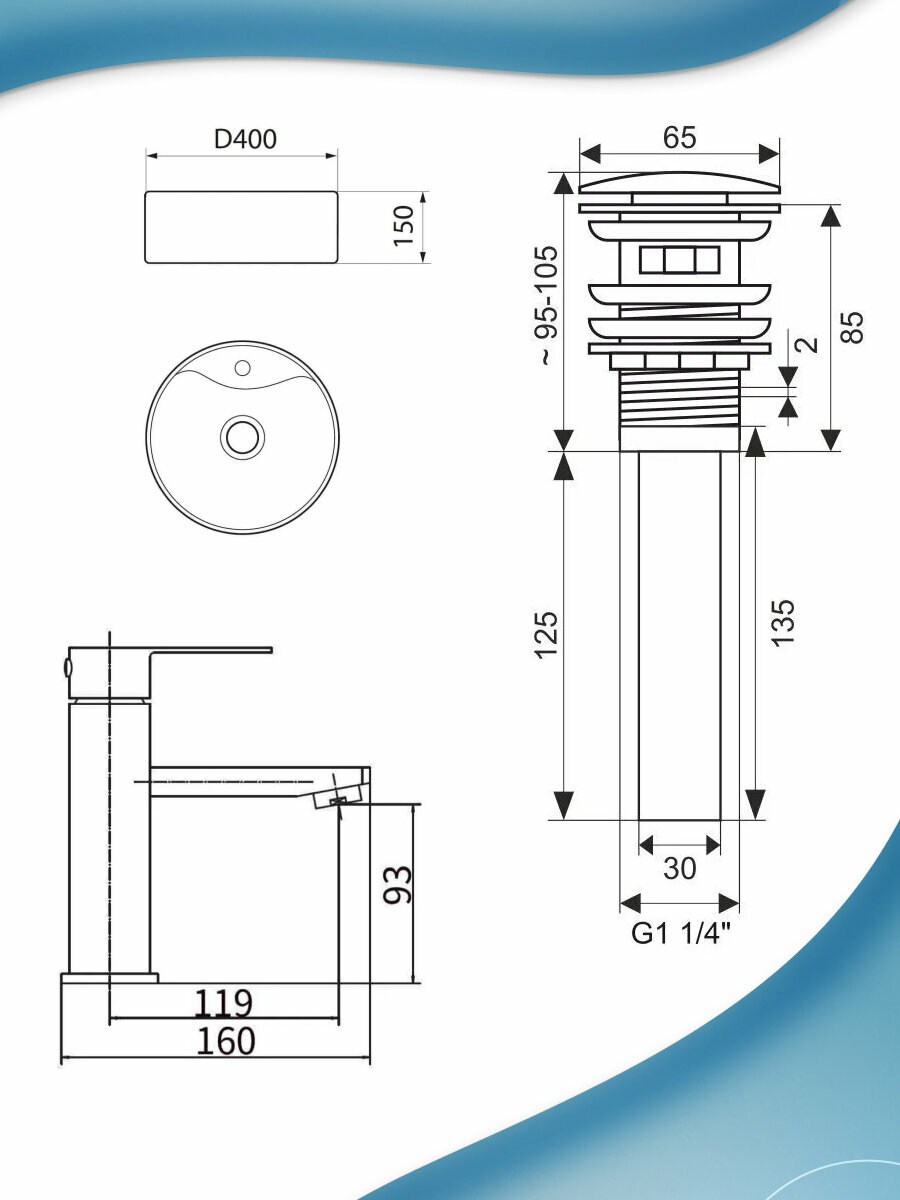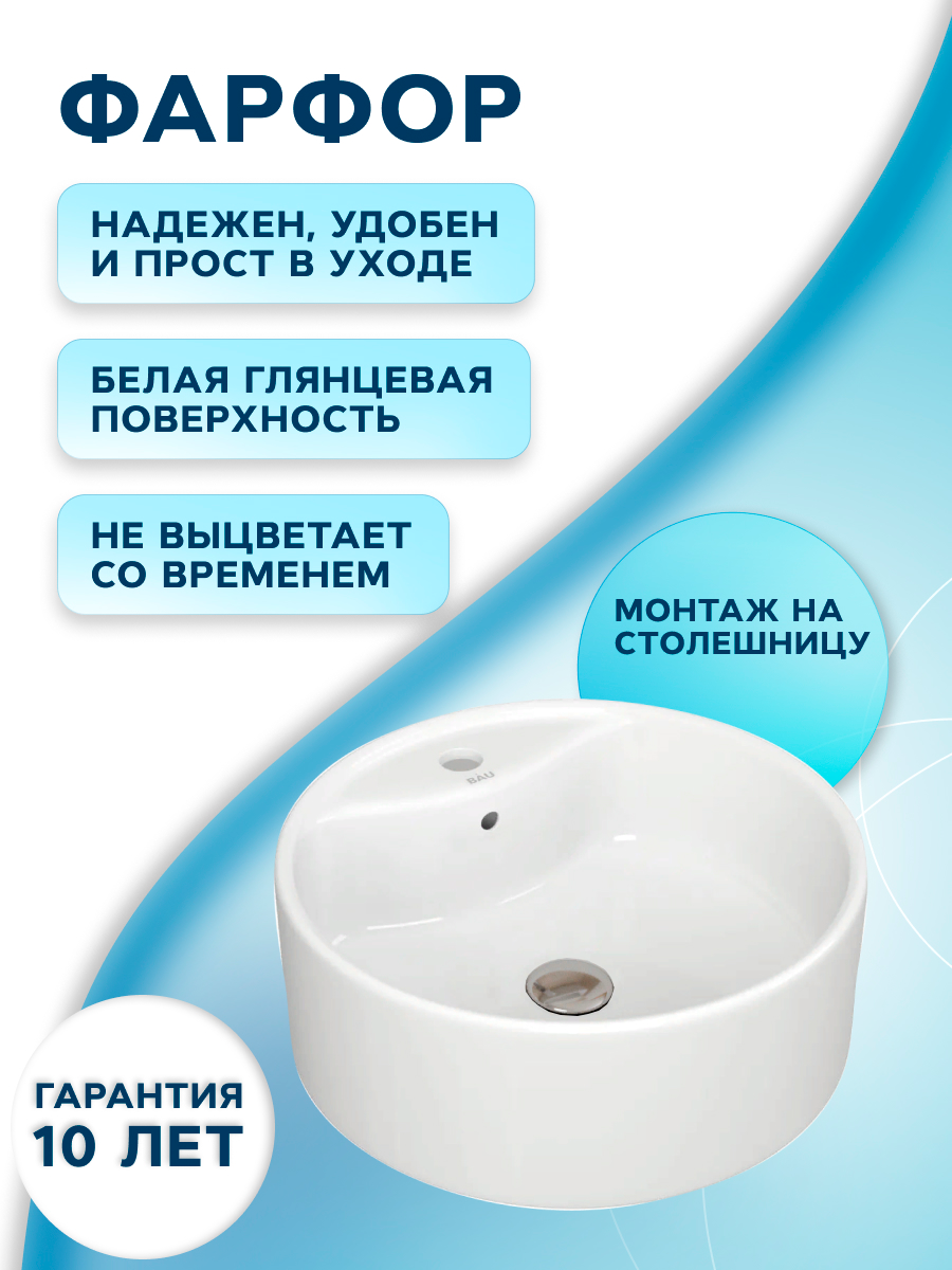 Раковина накладная со смесителем и выпуском (круглая BAU D40, белая + смеситель Hotel Still, нер. сталь, выпуск клик-клак хром) интересное: