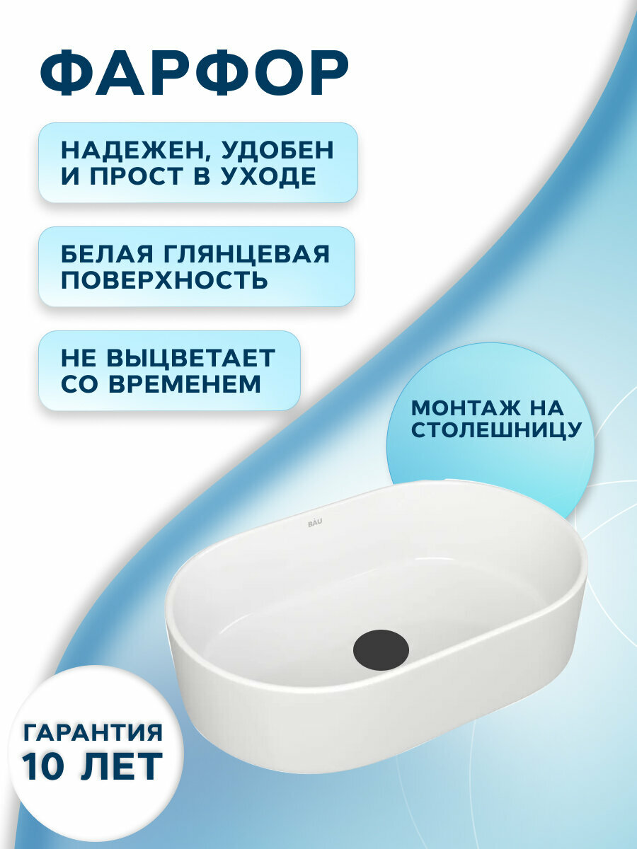 Раковина накладная со смесителем и выпуском (овальная BAU Nimb 56х36, белая + смеситель Hotel Still, нер. сталь, выпуск клик-клак черный) интересное:
