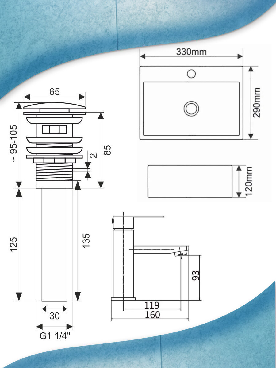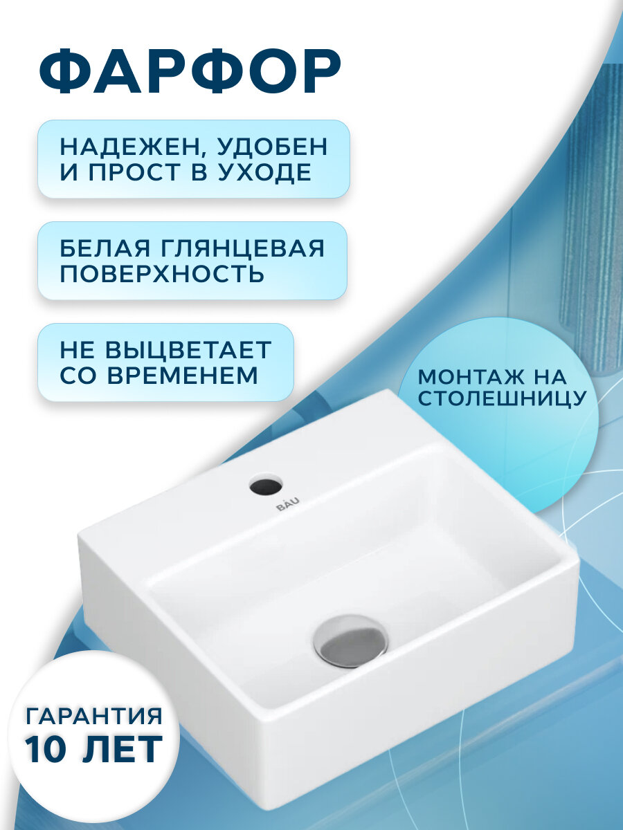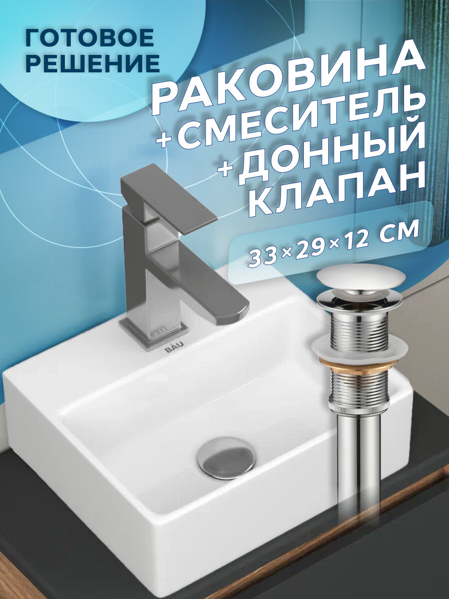 Раковина накладная со смесителем и выпуском (прямоугольная BAU Cerama Mini 33х28 + смеситель Hotel Still, нержавеющая сталь, выпуск) интересное: