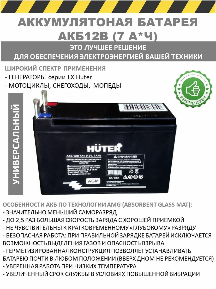 Батарея аккумуляторная АКБ 12В 7А.ч для бензиновых генераторов с электрическим запуском HUTER 64/1/54