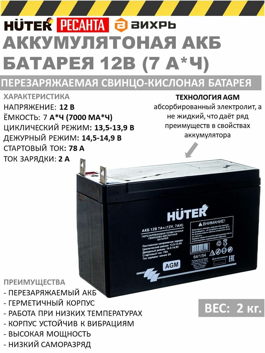 Аккумулятор Huter 64/1/54, 12В, 7Ач .