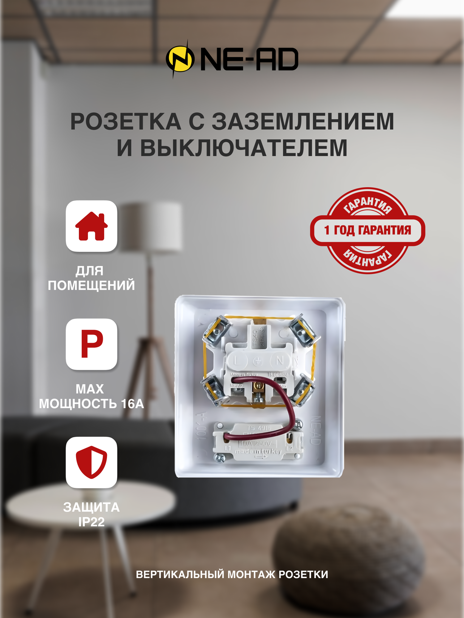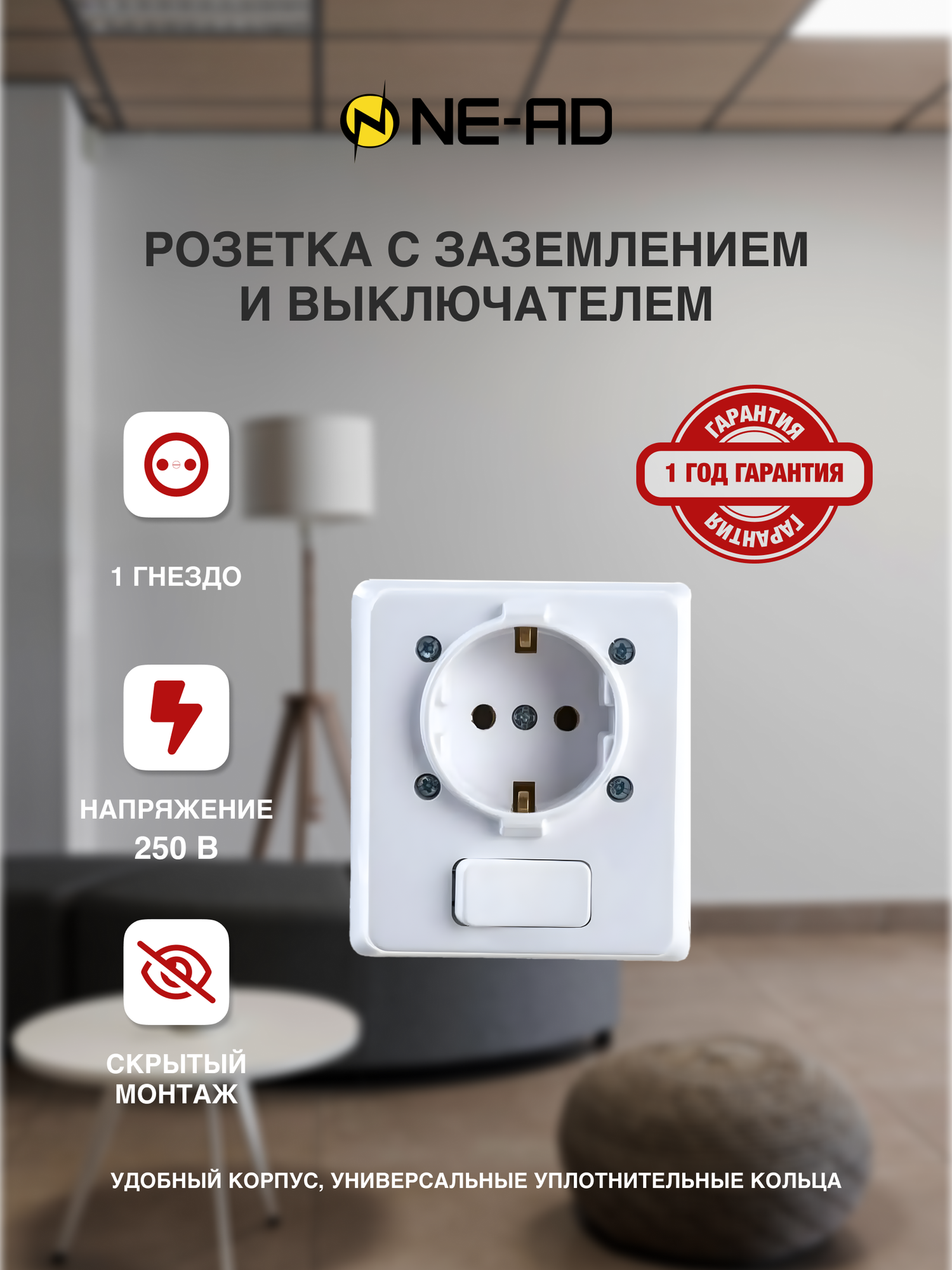 Розетка NE-AD Murat 1 гнездо с выключателем с/з для скрытой установки 16A 250В IP20 белый интересное: