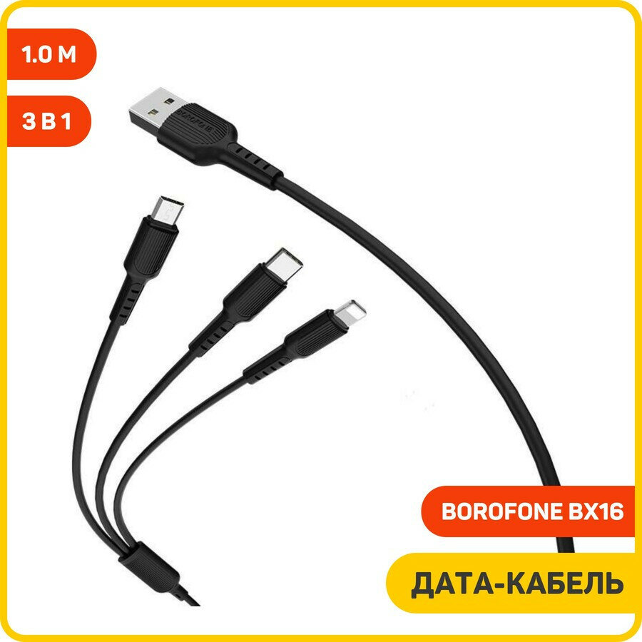 Дата-кабель Borofone BX16 (3 в 1) USB-Type-C/Lightning/MicroUSB, 1 м, черный