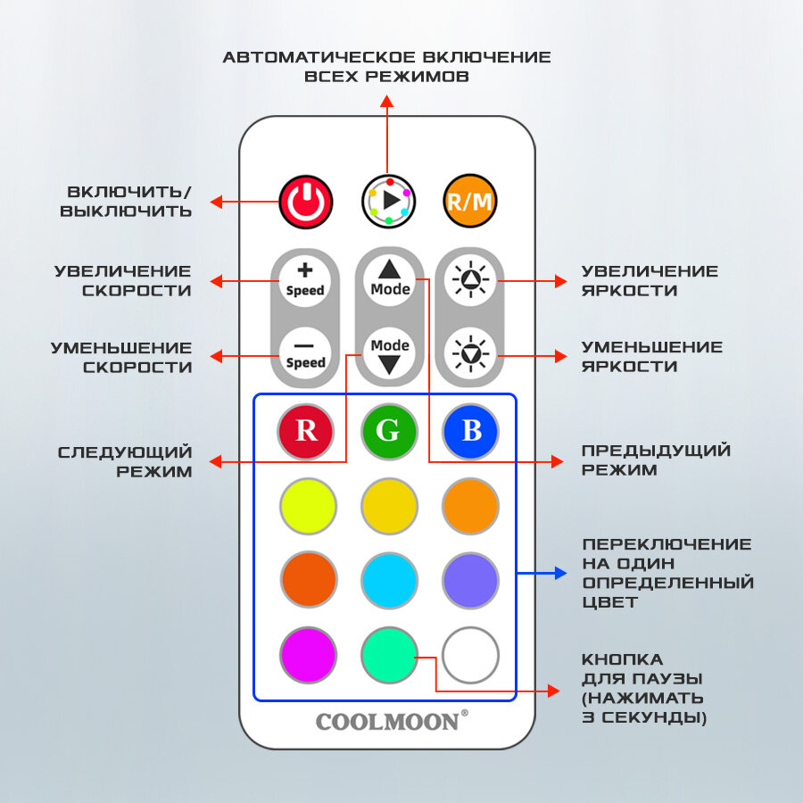 | Комплектация | Контроллер COOLMOON; - Пульт ДУ; - Провод SATA; - Провод PWM; - Провод ARGB; - Инструкция |