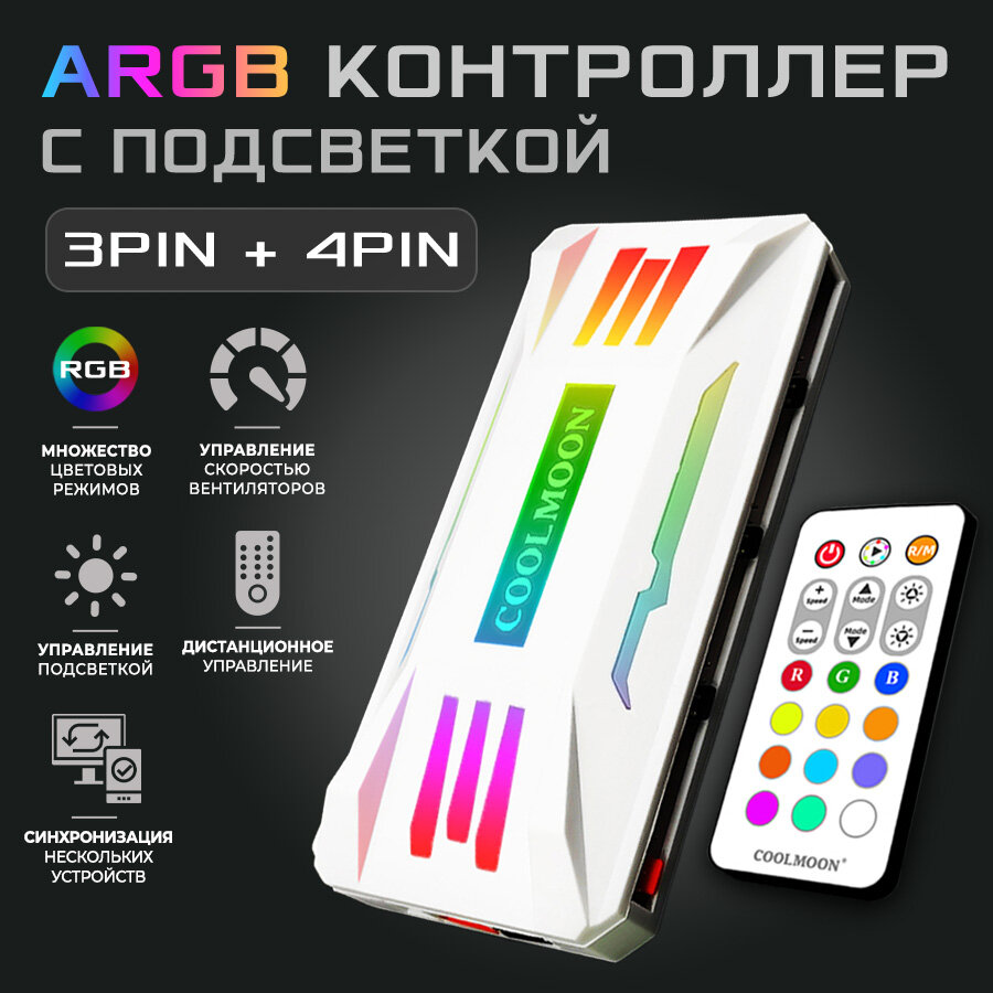 Контроллер COOLMOON с подсветкой для кулеров и светодиодных лент PWM+ARGB белый, 4pin + 3pin, ARGB хаб интересное: