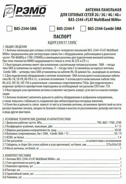 | Комплектация | антенна BAS-2344 «FLAT MultiBand MiMo», узел крепления на мачту, комплект крепежа, паспорт, гарантийный талон, упаковка |