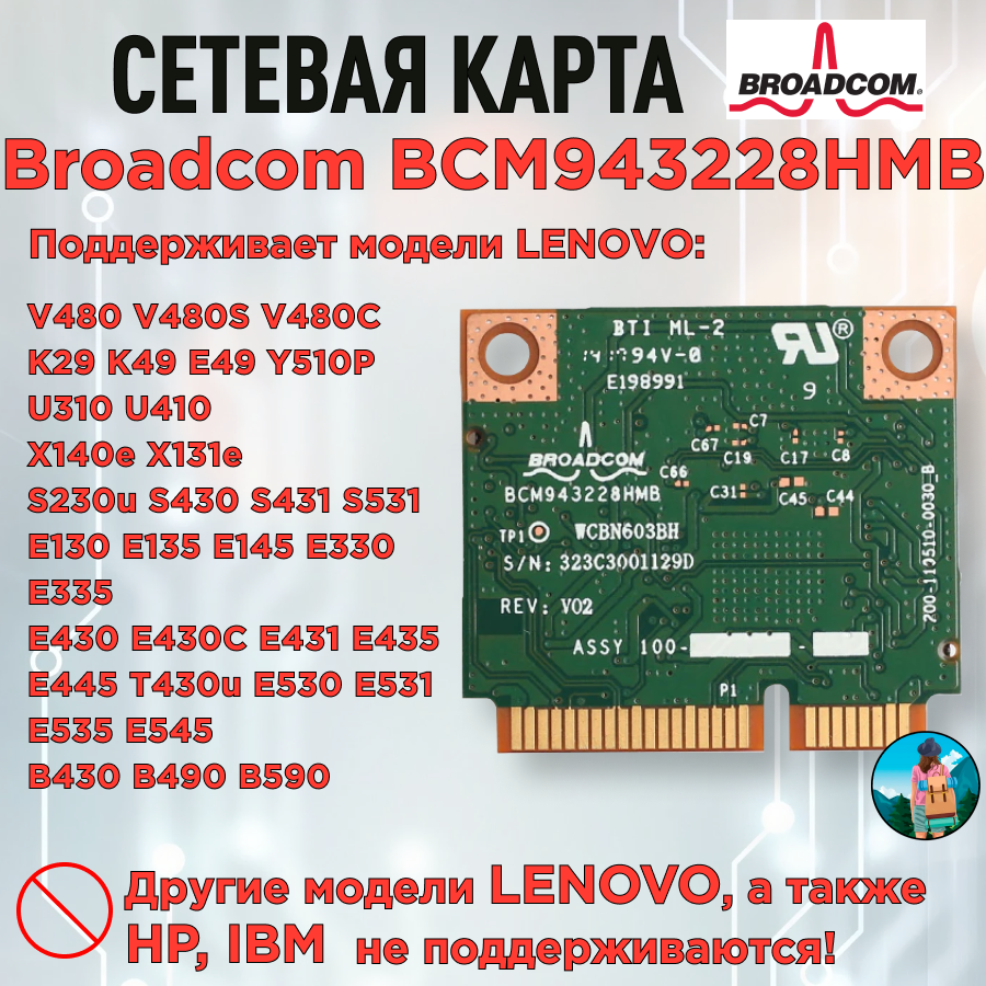 | Дополнительная информация | Беспроводная сетевая карта Broadcom BCM943228HMB E430 E431E530 E49K49 V480 Bluetooth - это двухчастотная сетевая карта, предназначенная специально для ноутбуков Lenovo моделей E430, E431, E530, E49, K49 и V480. |