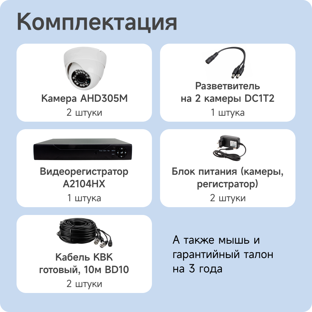 | Подробная комплектация | 4-х канальный AHD видеорегистратор ; Камера купольная для помещений 305M; Кабель для видеонаблюдения; Манипулятор "мышь"; Блок питания для регистратора; Блок питания для камер |