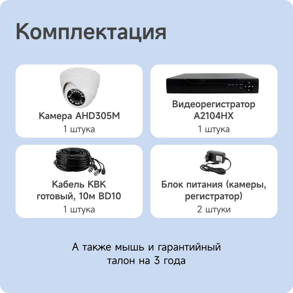 | Подробная комплектация | 4-х канальный AHD видеорегистратор ; Камера купольная для помещений 305M; Кабель для видеонаблюдения; Манипулятор "мышь"; Блок питания для регистратора; Блок питания для камер |