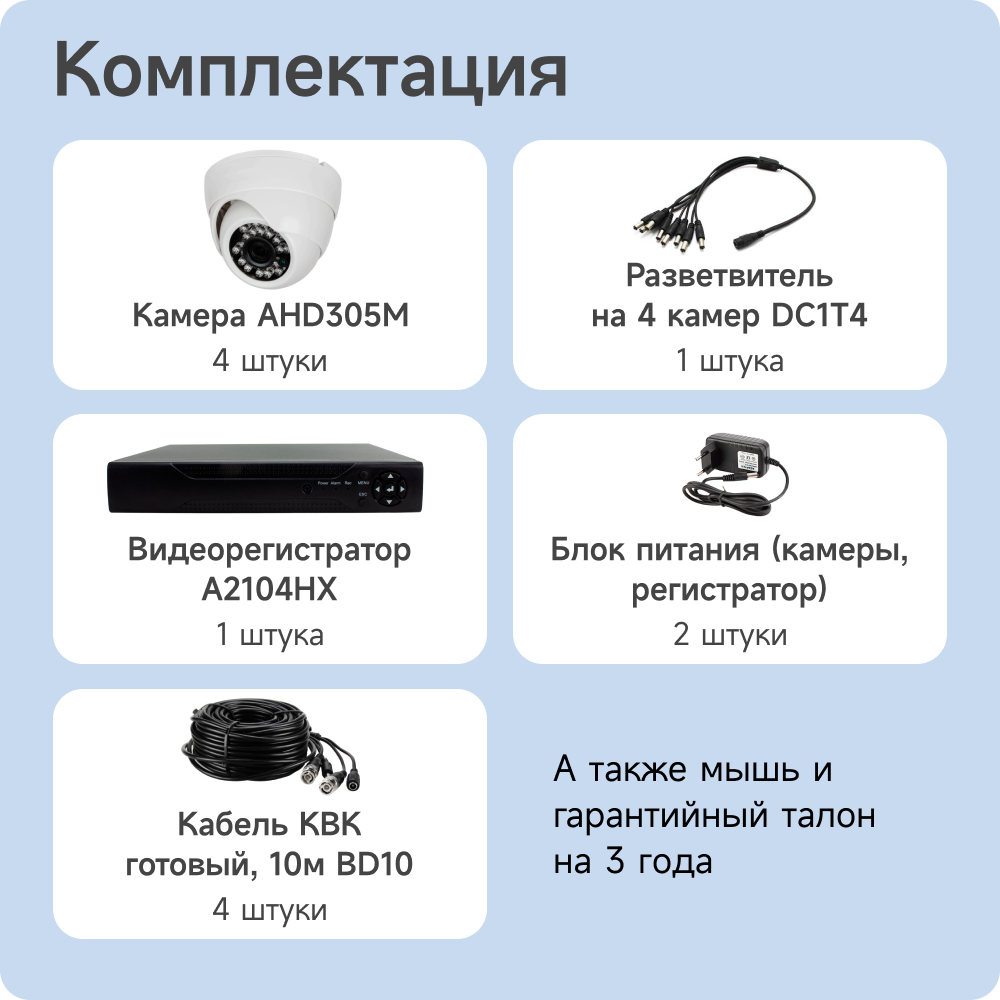 | Подробная комплектация | 4-х канальный AHD видеорегистратор ; Камера купольная для помещений 305M; Кабель для видеонаблюдения; Манипулятор "мышь"; Блок питания для регистратора; Блок питания для камер |