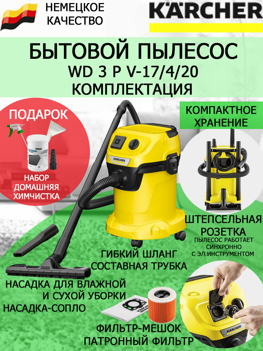 Пылесос с розеткой Karcher WD 3 P V-17/4/20+набор для химчистки, широкая насадка, переходник 5 ст интересное: