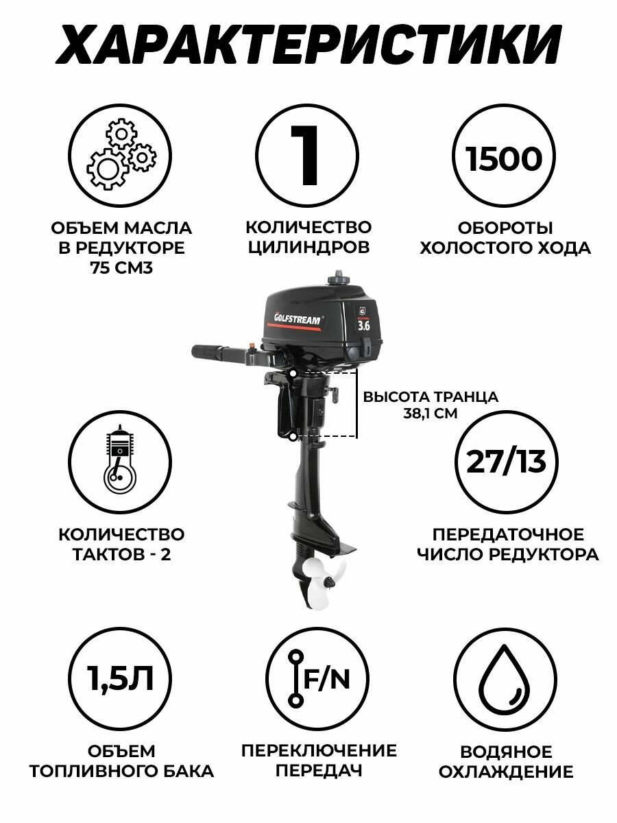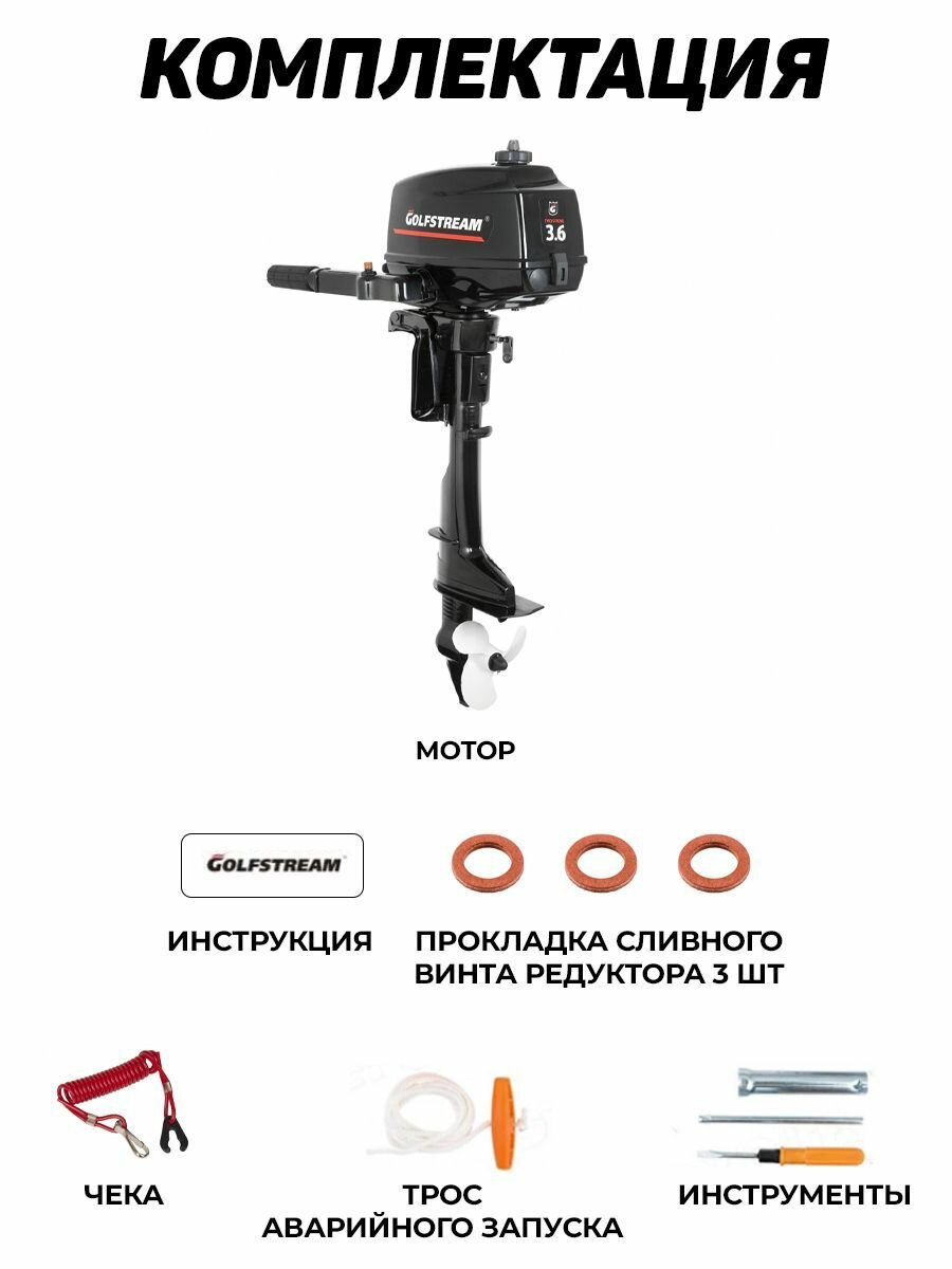 Лодочный мотор GOLFSTREAM T3.6BMS, бензиновый, 3.6 л.с., 75 куб.см, 2 тактный, 2.64 кВт интересное: