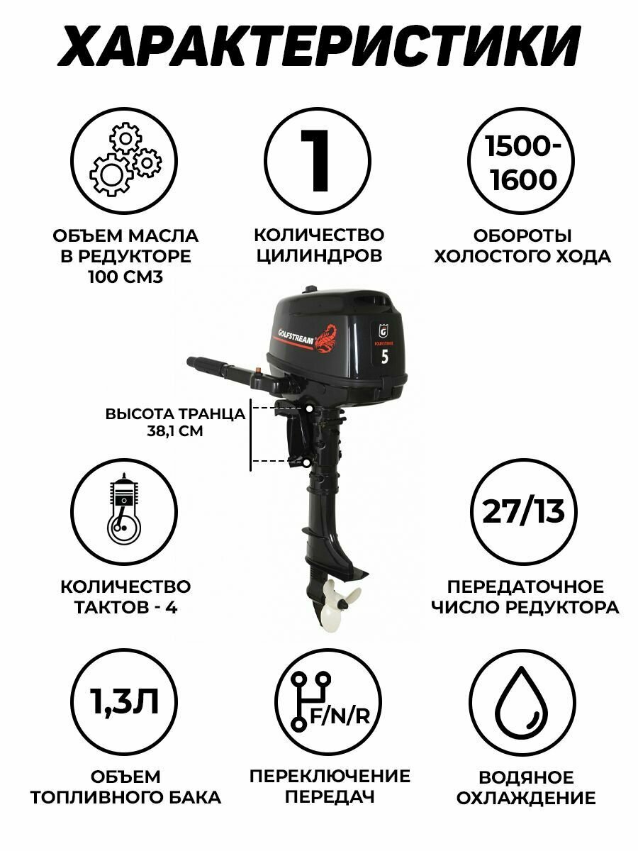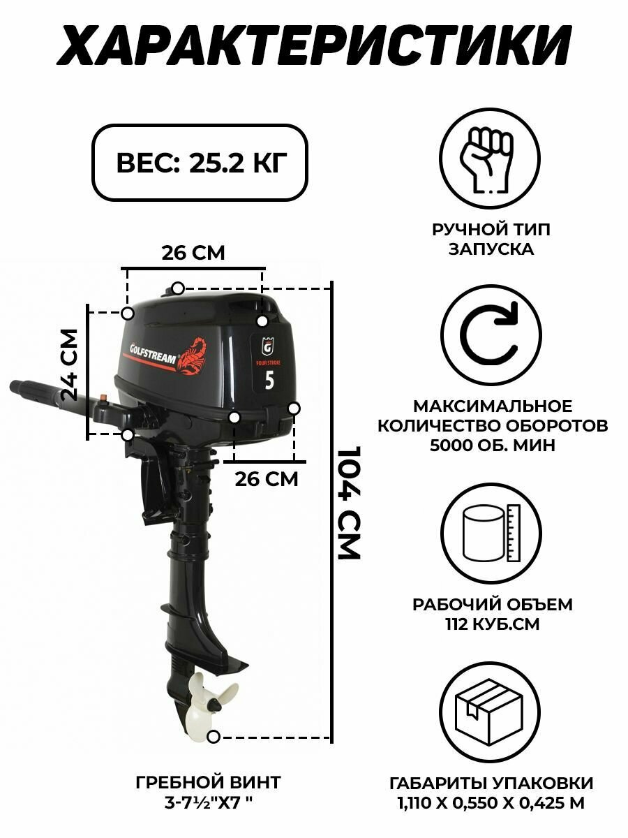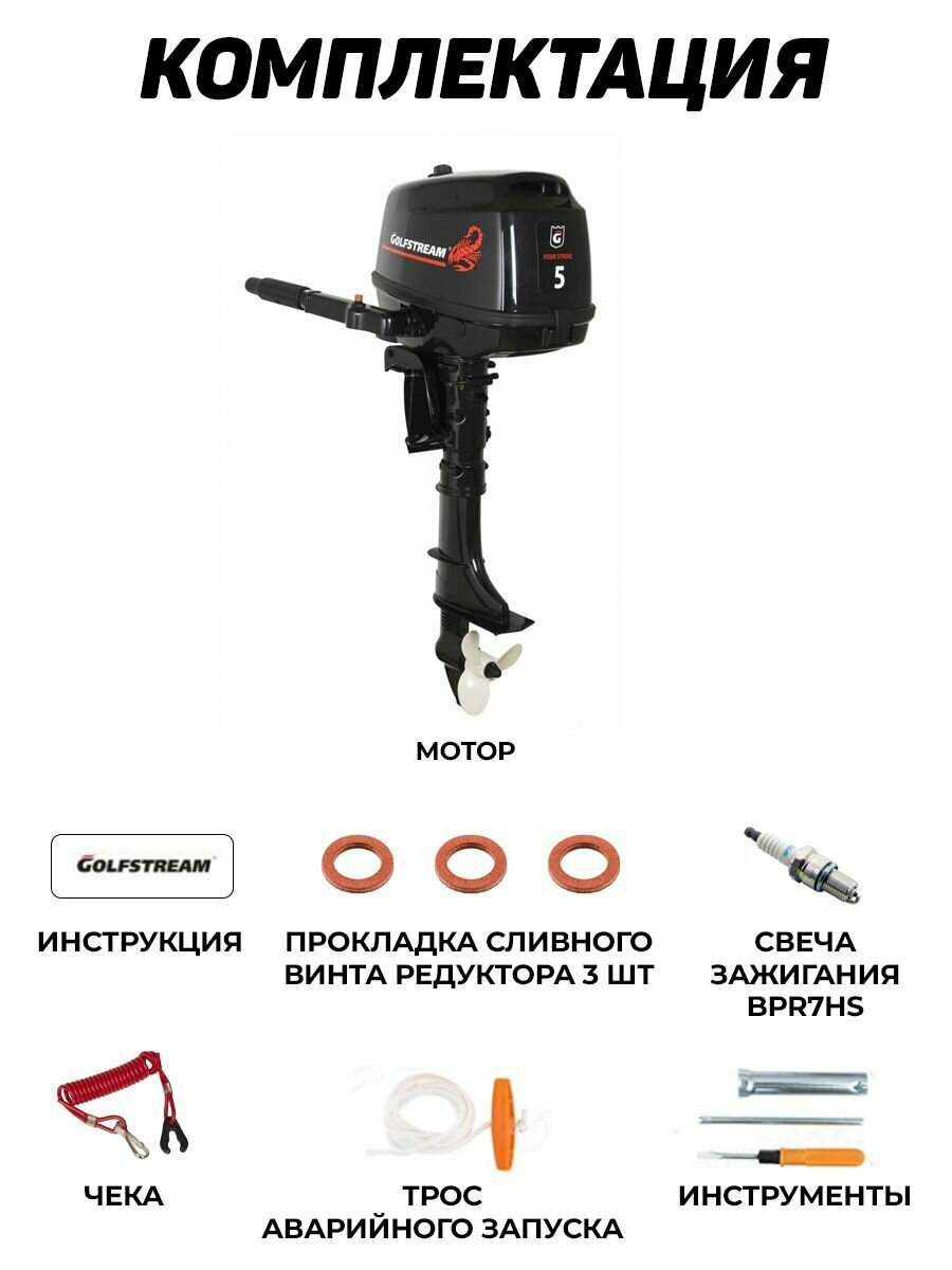 Лодочный мотор GOLFSTREAM F5.0BMS, бензиновый, 5л.с., 112 куб.см, 4 тактный, 3,67 кВт интересное: