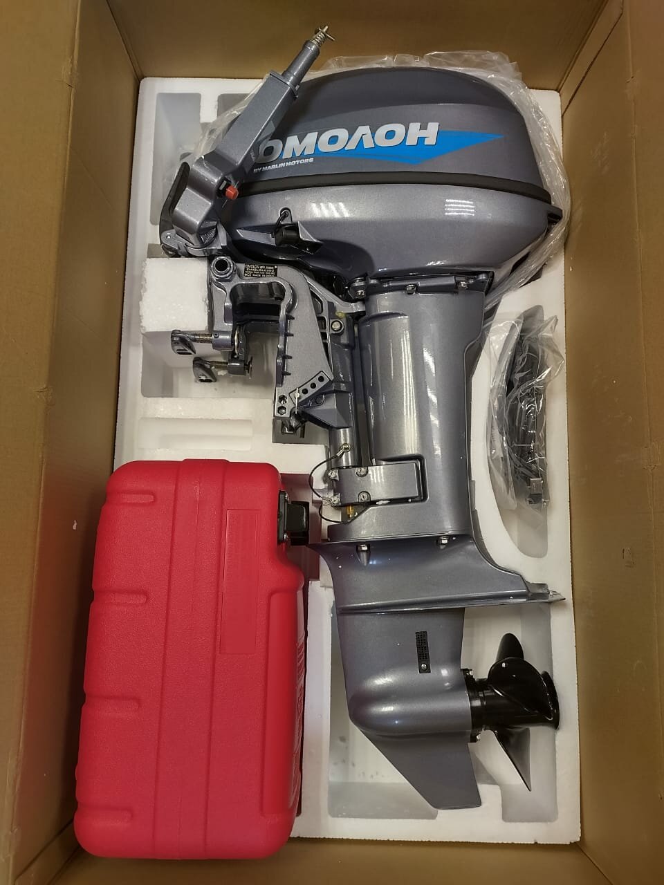 | Комплектация | Мотор в сборе с винтом, шнур аварийного запуска, шланг топливный с грушей и коннекторами, топливный бак 12 л, набор инструментов, руководство пользователя. |