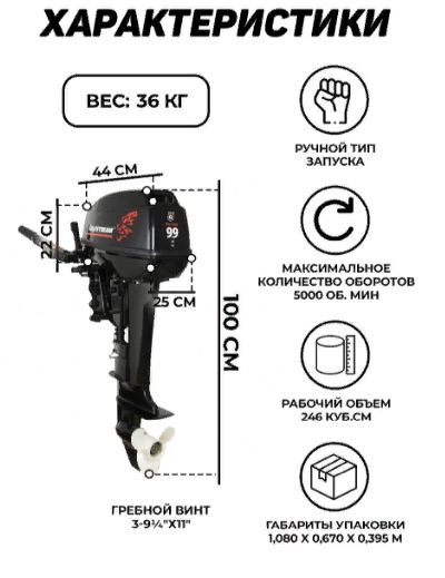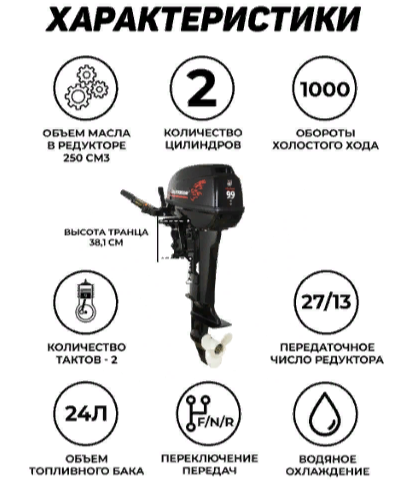 | Особенности | аварийный выключатель двигателя, передвижение по мелководью, регулировка угла наклона мотора, электронная система зажигания |