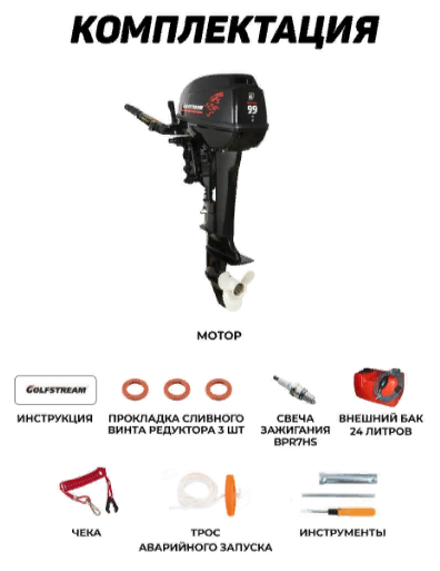 | Комплектация | мотор, переносной бак 24л, шланг, груша, паспорт двигателя, руков-во по эксплуатации, ЗИП |